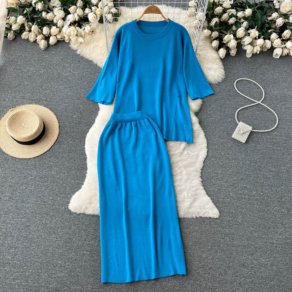 Solid color temperament suit spring and summer 2022 new large size loose knitted top split all-match skirt two-piece set 大きめサイズ スプリング 春物 サマー 夏物 スカート ソリッドカラー lyxaj98308496137