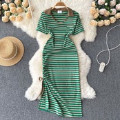Striped side slit dress summer new design irregular drawstring tie waist short-sleeved V-neck skirt サマー 夏物 スカート Vネック ストライプ lyxaj16229970180