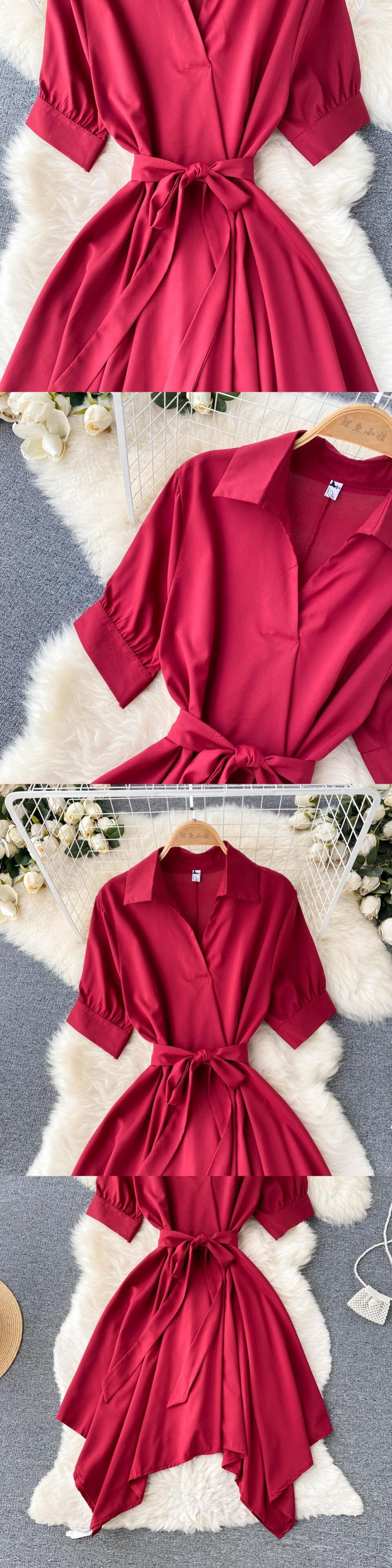 フランスの優しい風ラペル半袖ドレス女性の2022年夏の新しいレースウエスト不規則なAラインスカート サマー 夏物 lyxaj97011990182