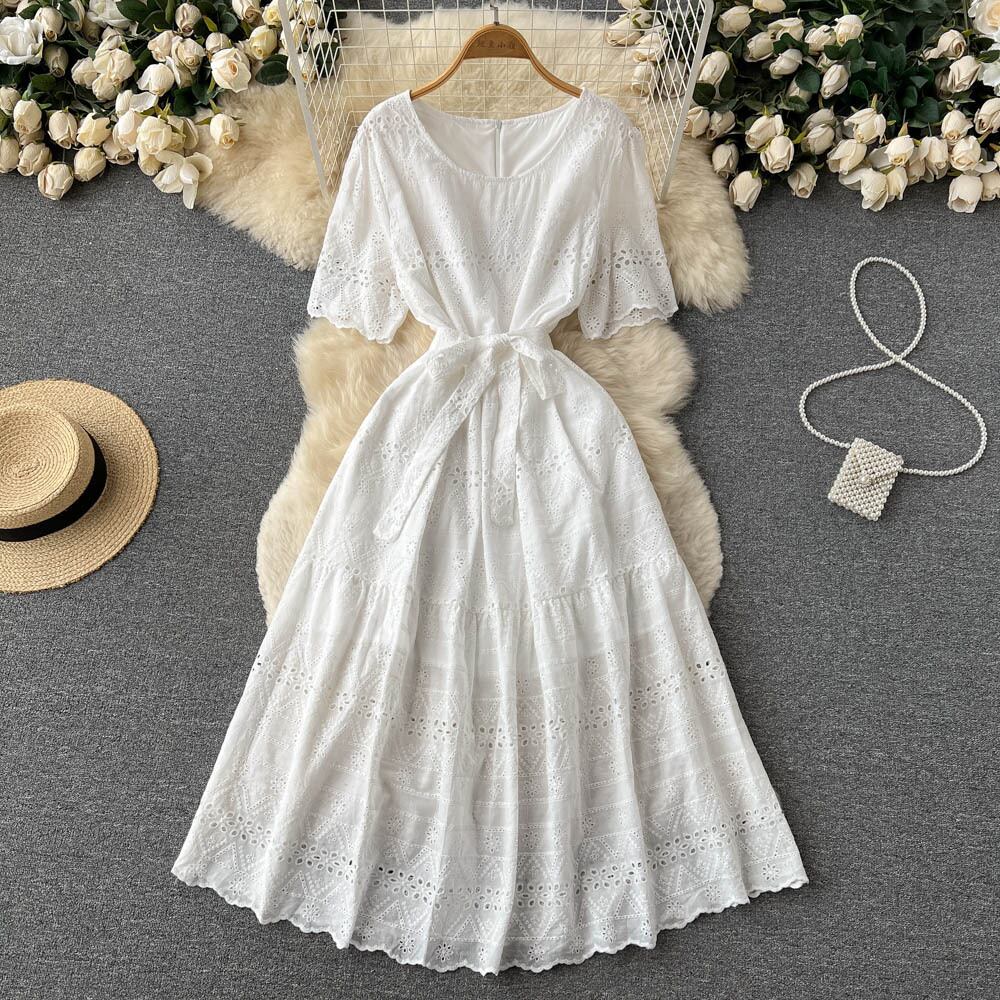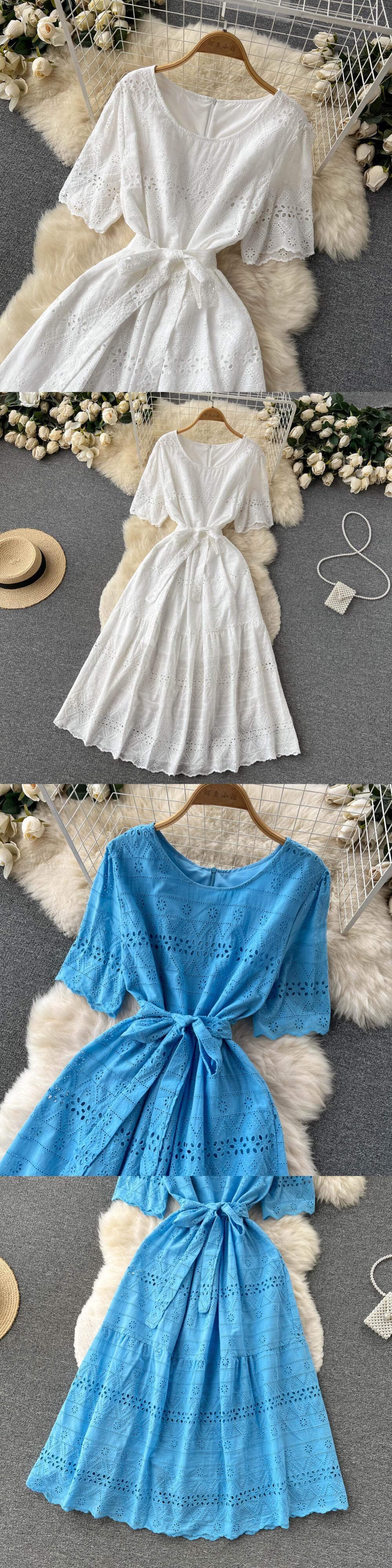 フランスの優しい風エレガントな女性の気質のドレス女性の夏の新しいレースのウエスト細い中空Aラインスカート サマー 夏物 lyxaj85215179732