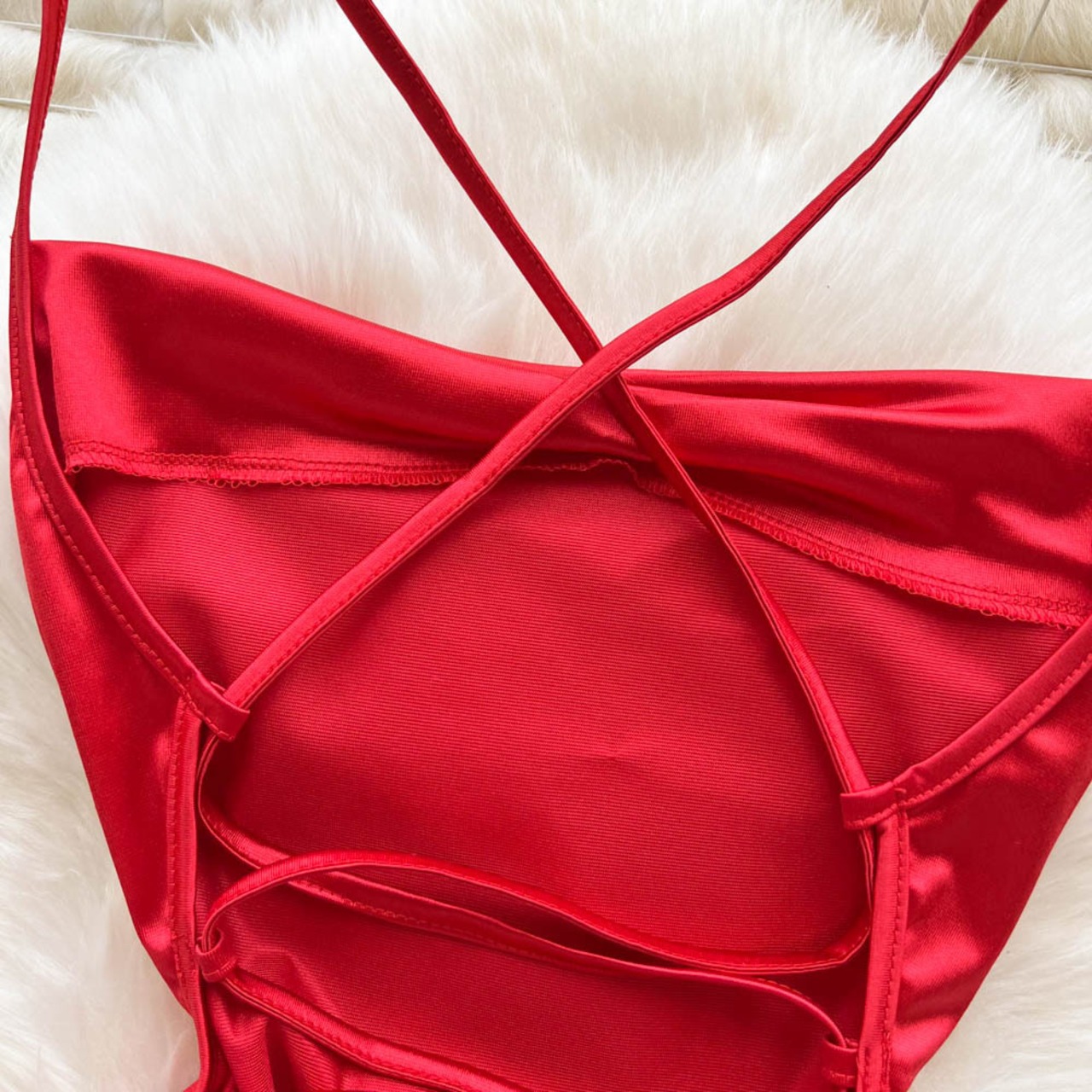 夏の新しいネット赤セクシーな胸純粋な欲望ホットな女の子スタイルのサテンサスペンダードレスタイトバッグヒップショートスカート レッド サマー 夏物 ピュア lyxaj70145099446