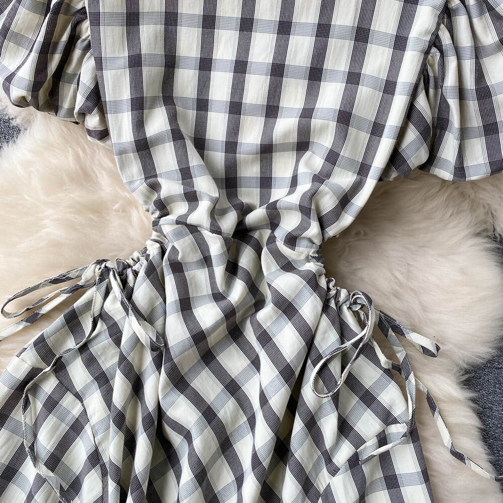 レトロなチェック柄のドレス夏の女性のデザインセンスニッチな陰謀中空アウトウエストスリムミドル丈ベルフラワースカート サマー 夏物 フラワーデザイン lyxaj92578786038