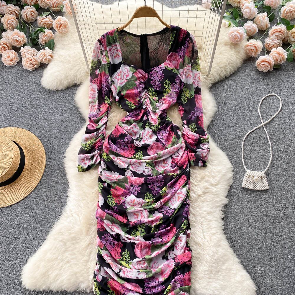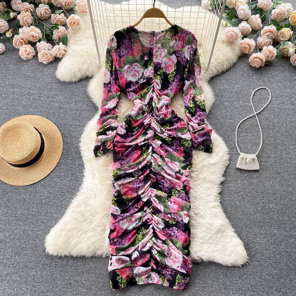 エレガントでフェミニンなフローラルドレス、長袖、陰謀、プリーツ、スリムフィット、ヒップレングスドレス、気質、スリミングドレススカート ロング 花柄 lyxaj16296141721