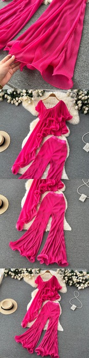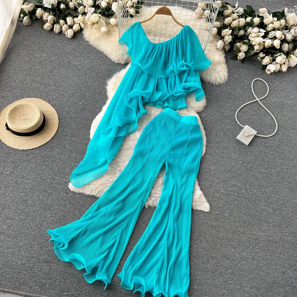 ヨーロッパとアメリカのインシックなデザインセンススーツ女性のファッション気質蓮の葉トップハイウエストワイドレッグパンツツーピースセット ハイウェスト ワイドパンツ ヨーロピアン lyxaj8110973919