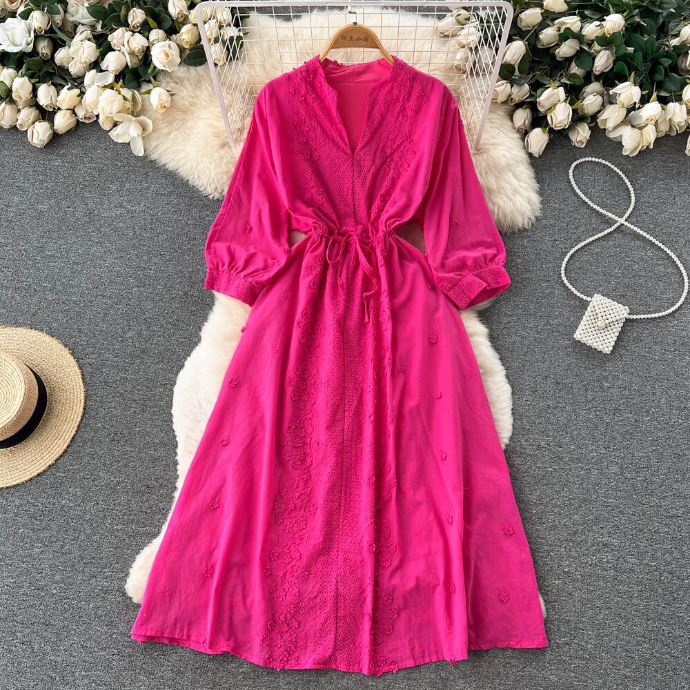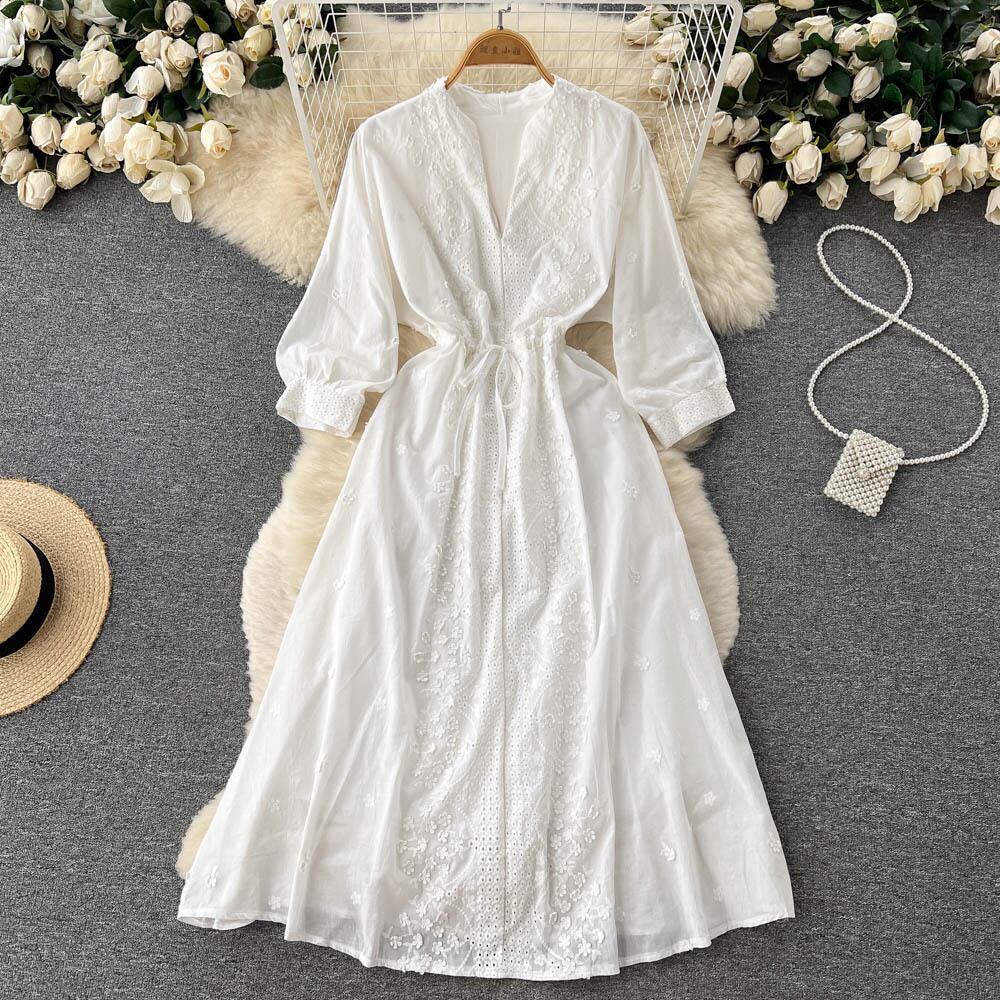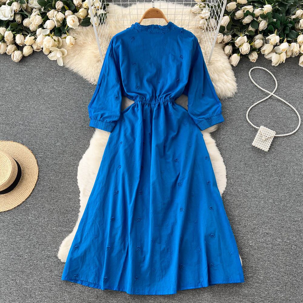 レトロなヘップバーンスタイルのバブル長袖ドレス2022新しいドローストリングウエストと大きなスイングミドル丈気質Aラインスカート ロング lyxaj60503774369