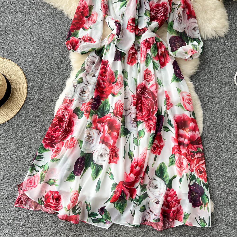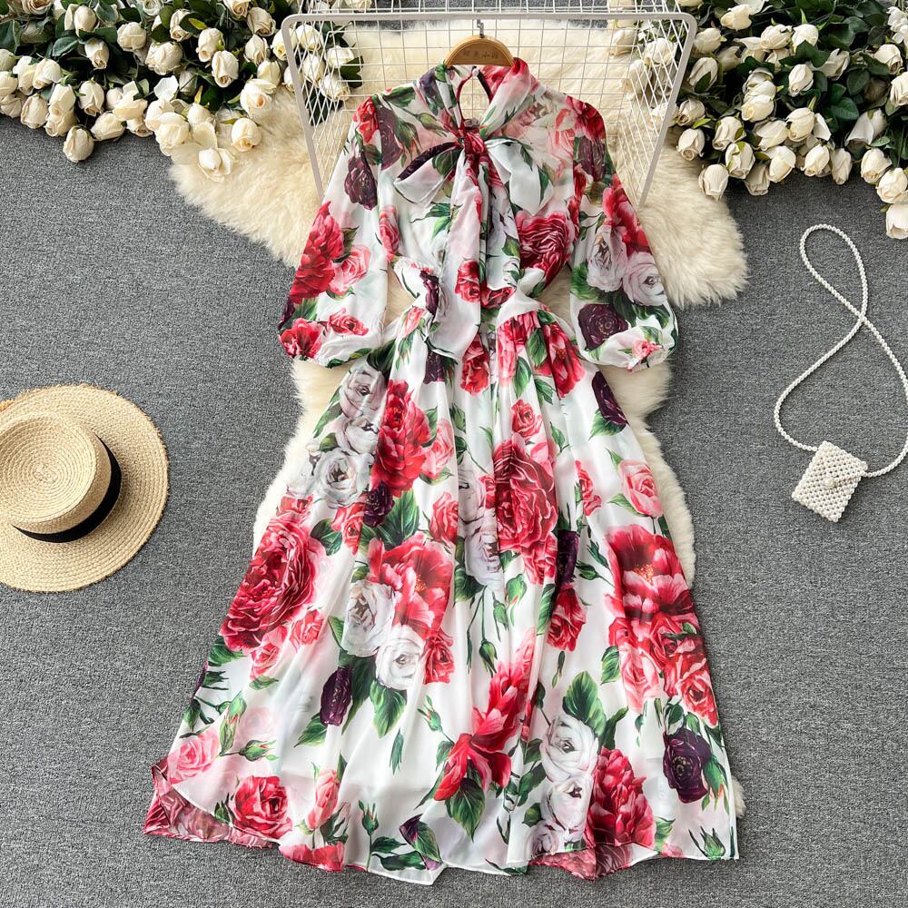 ヨーロッパとアメリカンスタイルのレトロなプリントのボウネックハイウエストスリムホリデーロングスカート気質エレガントなシフォンドレス ハイウェスト リボン ヨーロピアン lyxaj15972019636