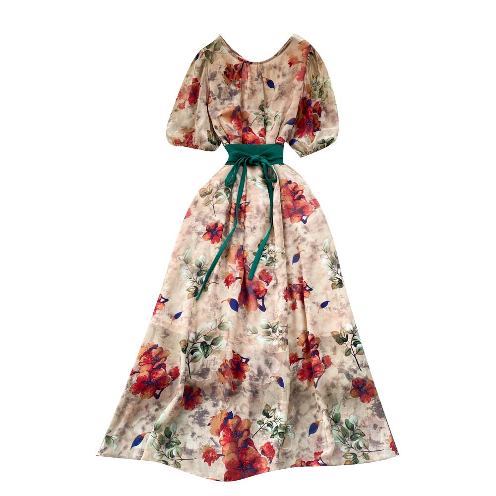 レトロな油絵プリントドレス女性2022年夏新しい年齢を減らすパフスリーブスリムミドル丈フレンチベルフラワースカート サマー 夏物 フラワーデザイン lyxaj59170895012