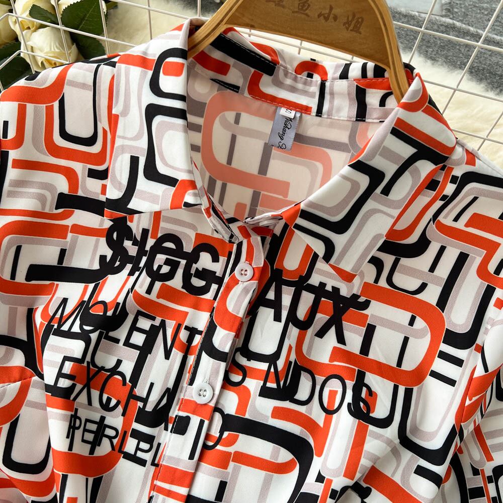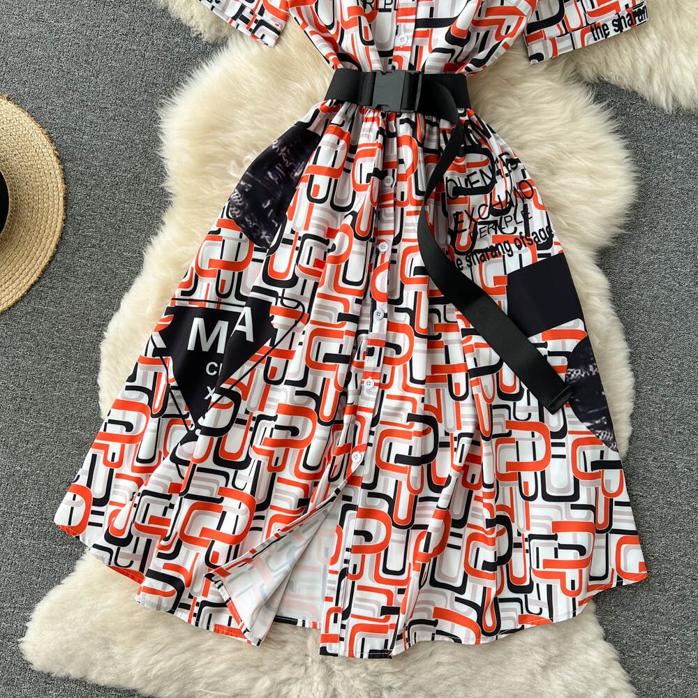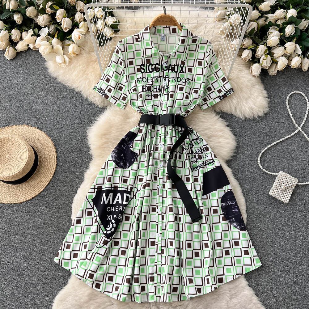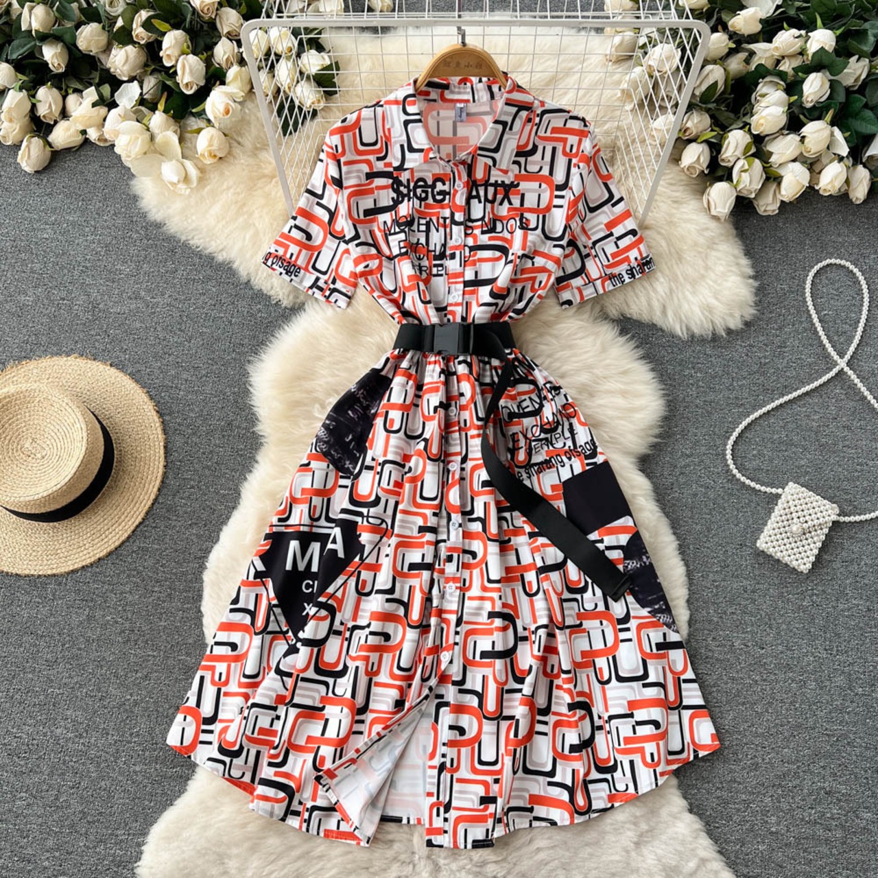 半袖タートルネックワンピース2022年夏新作レースアップウエストスリミングレトロプリント大スイングAラインスカート サマー 夏物 Oネック lyxaj535207101