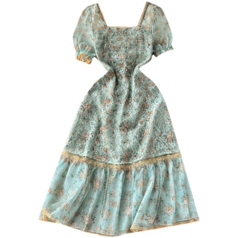 プリンセススタイルティーブレイクフレンチハイエンドスクエアネックドレスレディースサマーウエストスリム気質バブルスリーブAラインスカート 夏物 スクウェア lyxaj39892109564