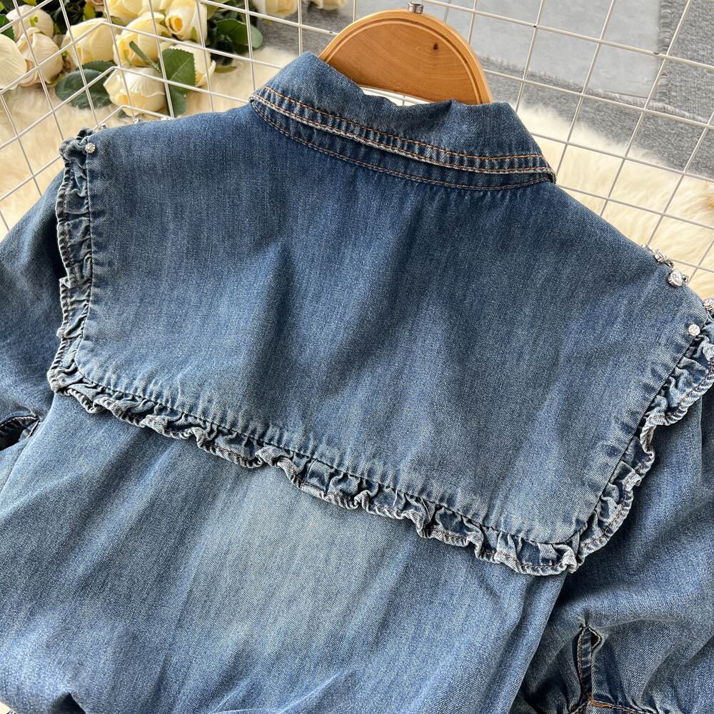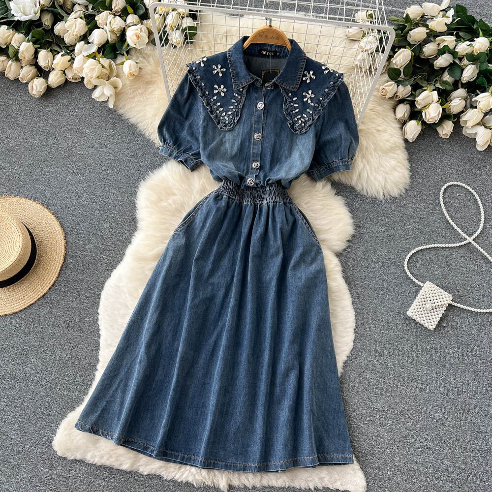 レトロなラペルダイヤモンドをちりばめたデニムドレスレディースサマーパフスリーブウエストスリムAラインラージスイング気質ミドル丈スカート 夏物 lyxaj74821896136