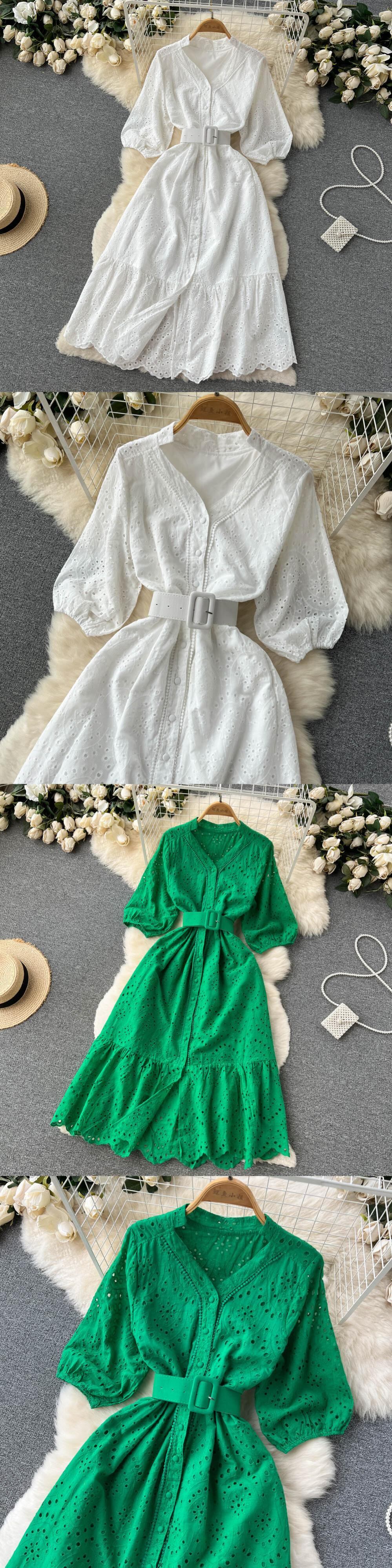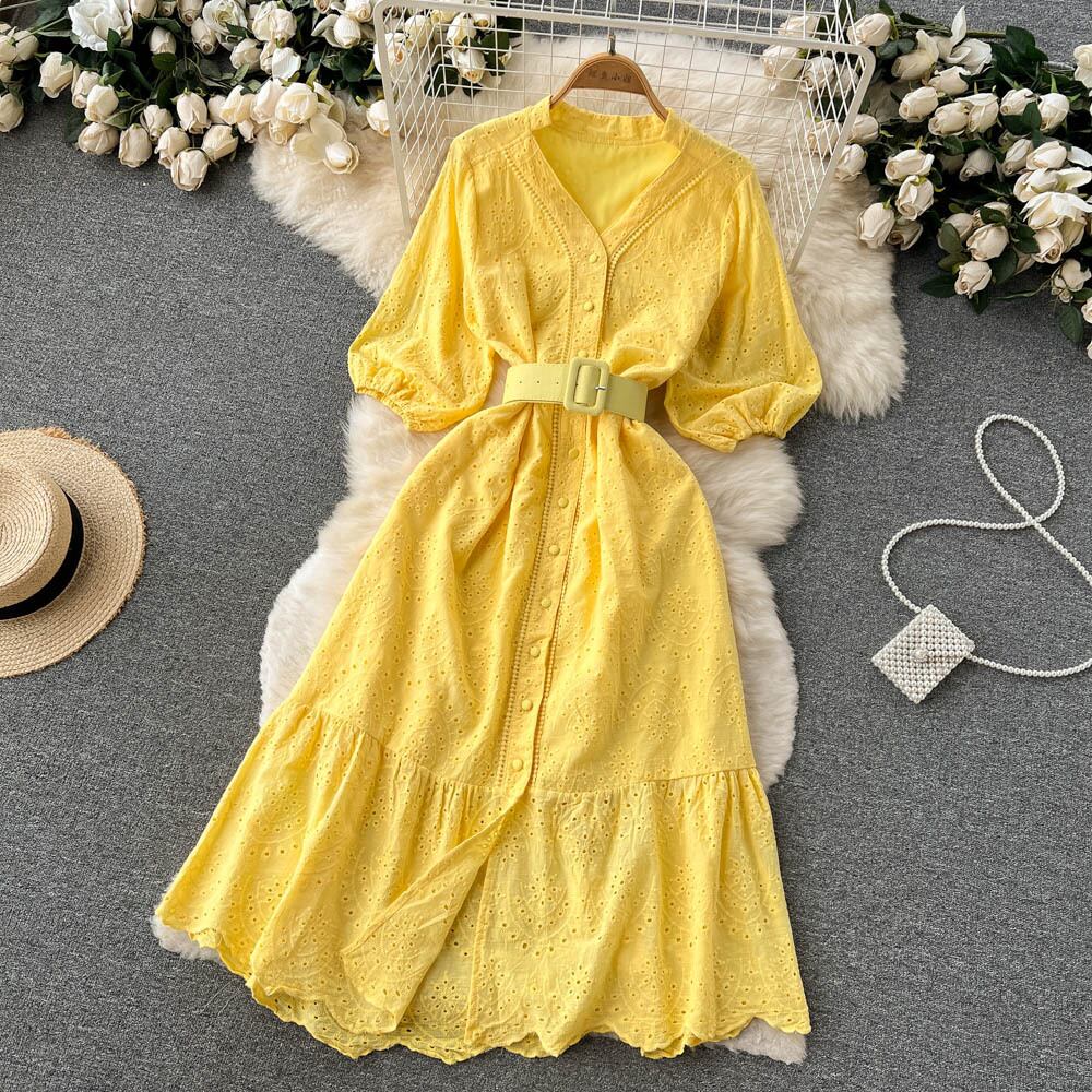 優しい風中空Vネックパフスリーブドレス2022年夏新作ファッション気質ウエストフェアリーロングスカート サマー 夏物 lyxaj17187153483