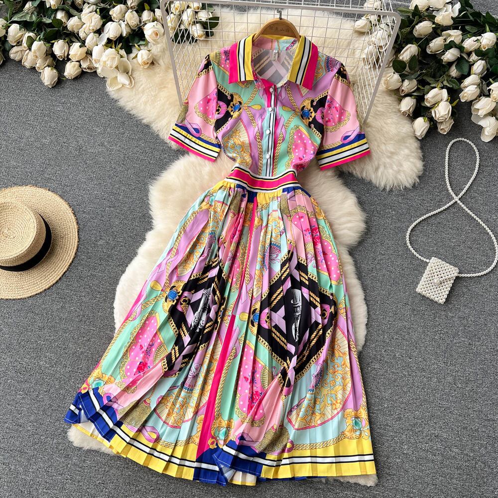 スモールデザインセンスレトロプリントポロカラー半袖ワンピースウエストスリミングハイエンドプリーツロングスカート lyxaj7186149153