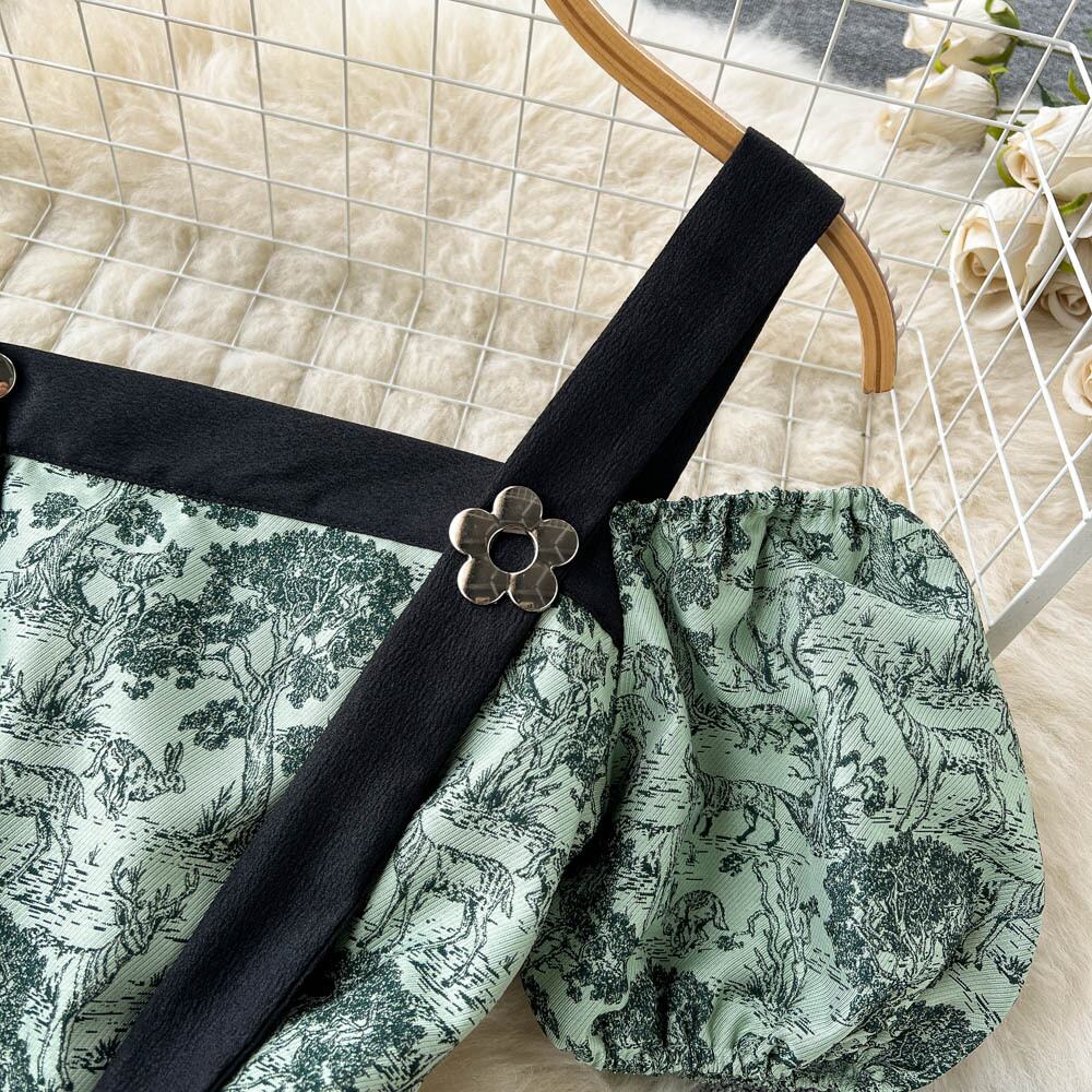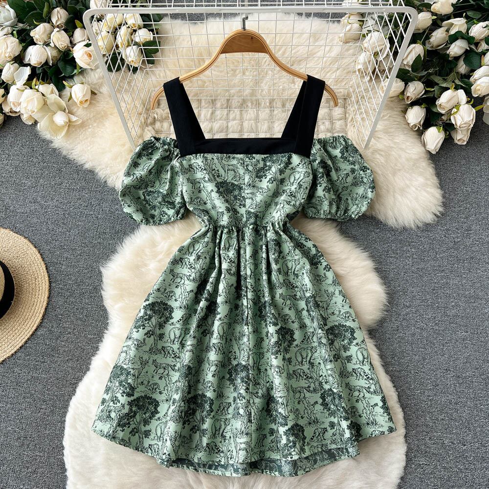 テンペラメントプリントのサスペンダードレスウエストは細くて小さいレトロな半袖Aラインスカート女性2022年夏新作 サマー 夏物 lyxaj4020866957