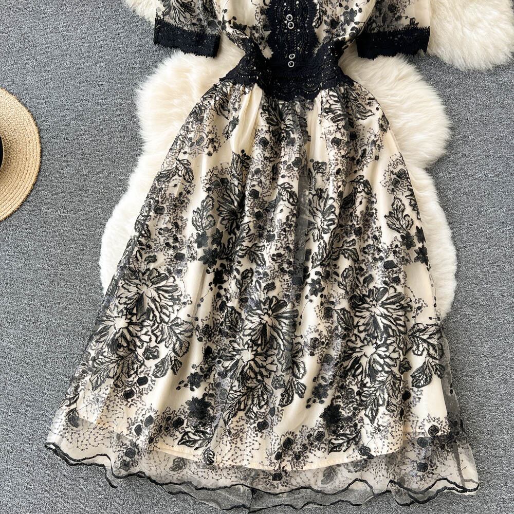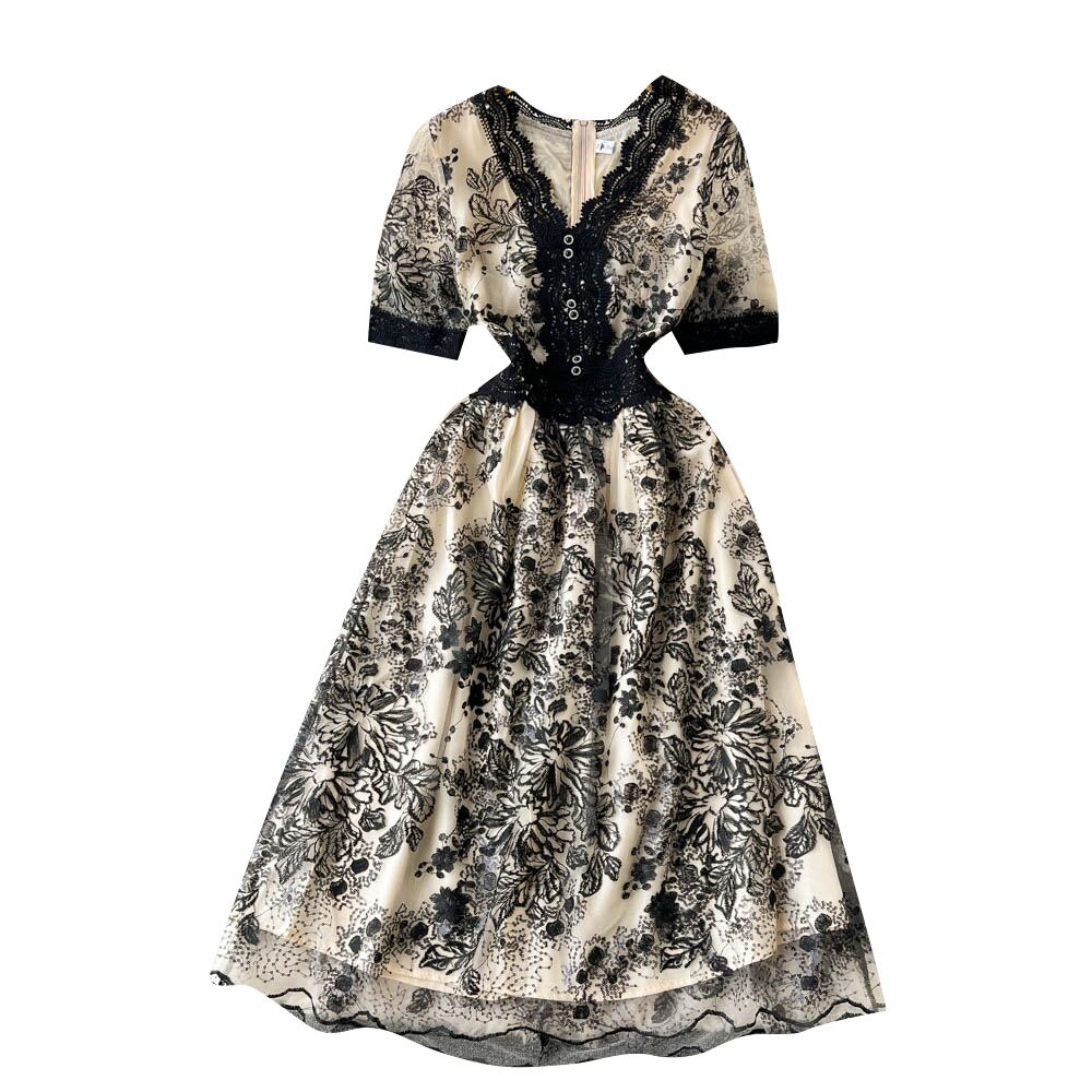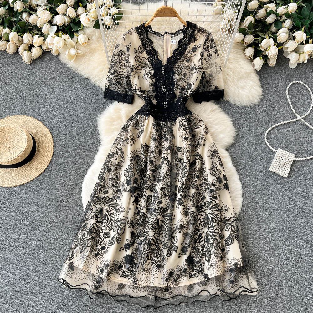 優しいスタイルのフレンチレトロメッシュ刺繍レースVネックワンピースウエスト気質ミドル丈ラージスイングAラインスカート女性 レッド lyxaj94711875109