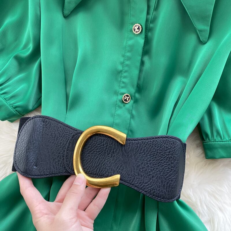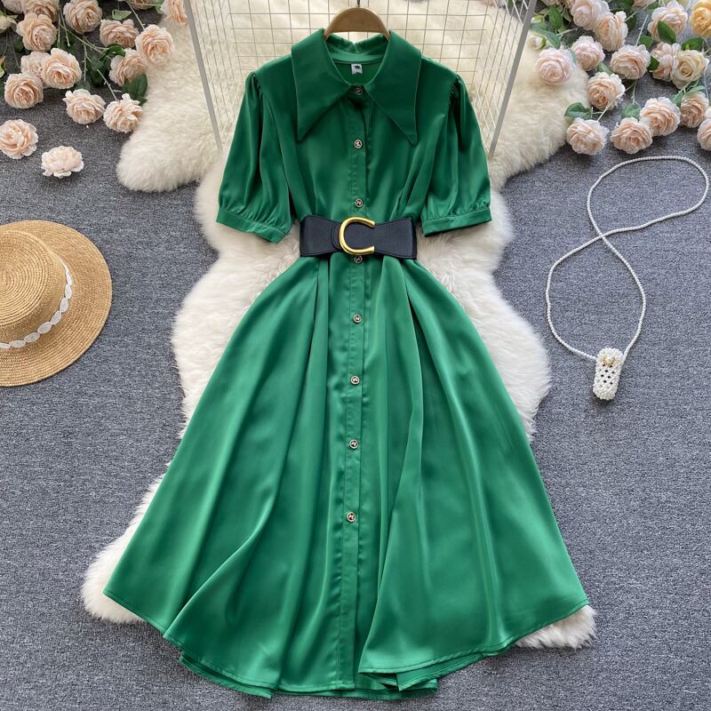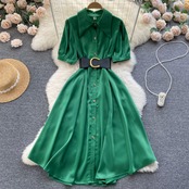 セレブ気質ポロカラーシングルブレストミドル丈ワンピースレディースレースアップウエストパフスリーブ膝丈ロングスカート lyxaj95306863661