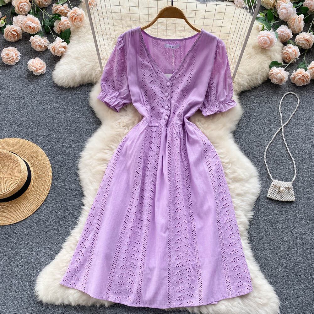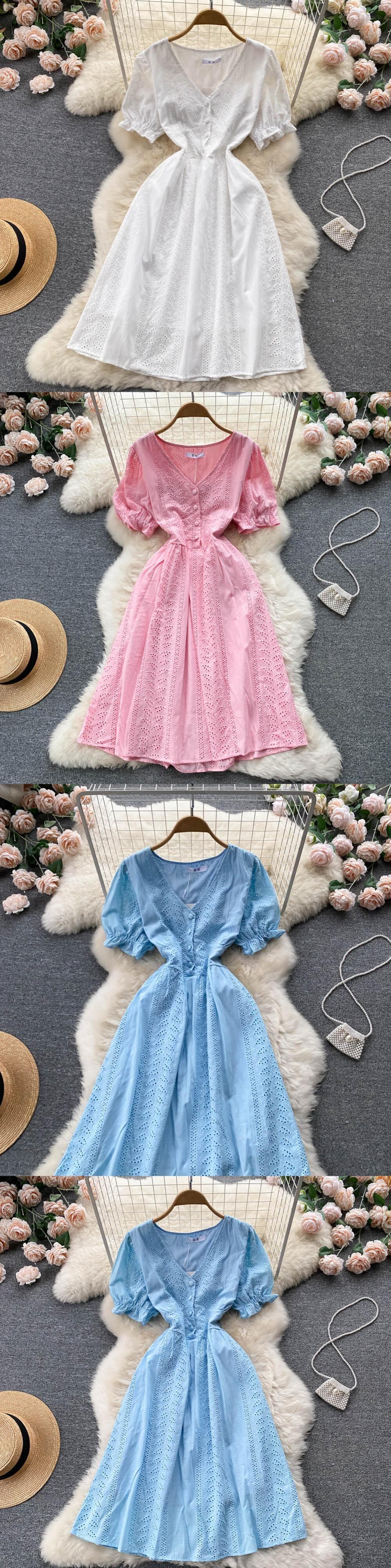 フランスのエレガントな軽くて馴染みのあるVネックドレス女性の夏の新しいウエストを減らす年齢を減らすパフスリーブ気質スーパーフェアリーAラインスカート サマー 夏物 lyxaj53315939997