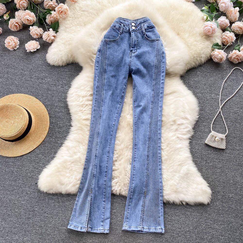 ハイウエストマイクロフレアジーンズレディース2022夏ニュー香港フレーバーレトロパーソナリティホットドリルスリムスリットロングパンツ レッド サマー 夏物 lyxaj20463333349