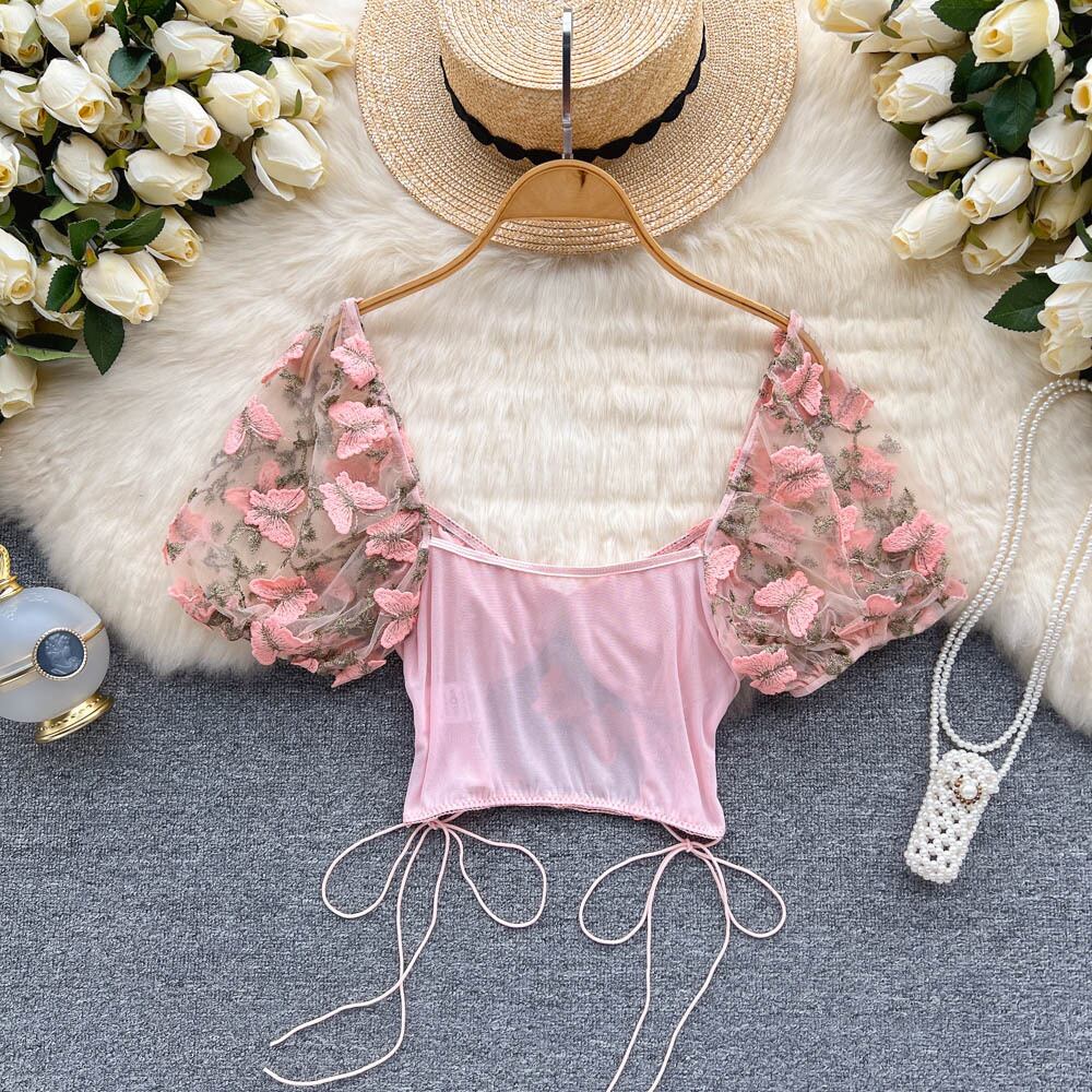 セクシーなチューブトップフローラルパフスリーブシャツレディースデザインセンセーションスモールホットガールズウェアハイウエストショートへそトップス夏 サマー 夏物 花柄 lyxaj7904702217