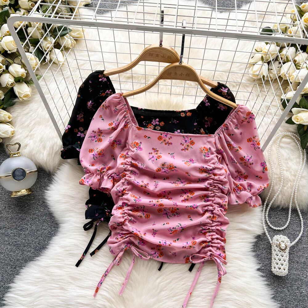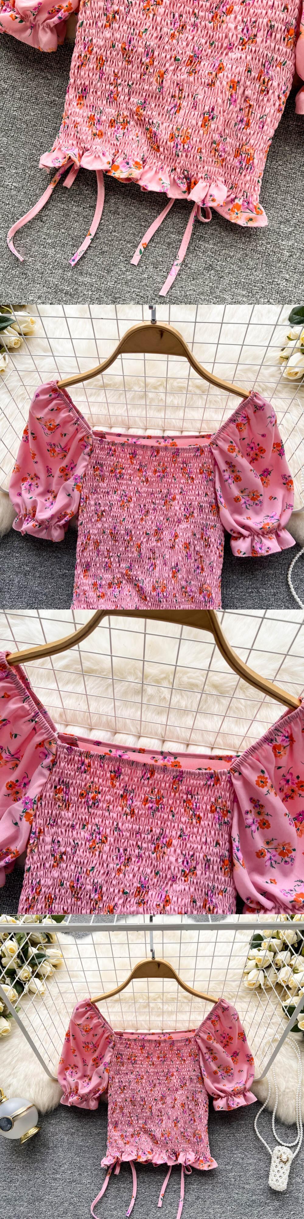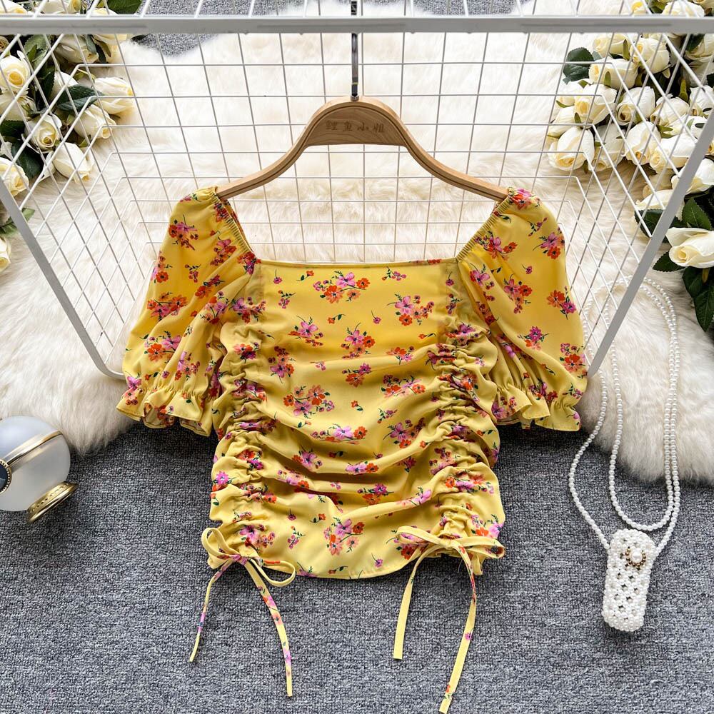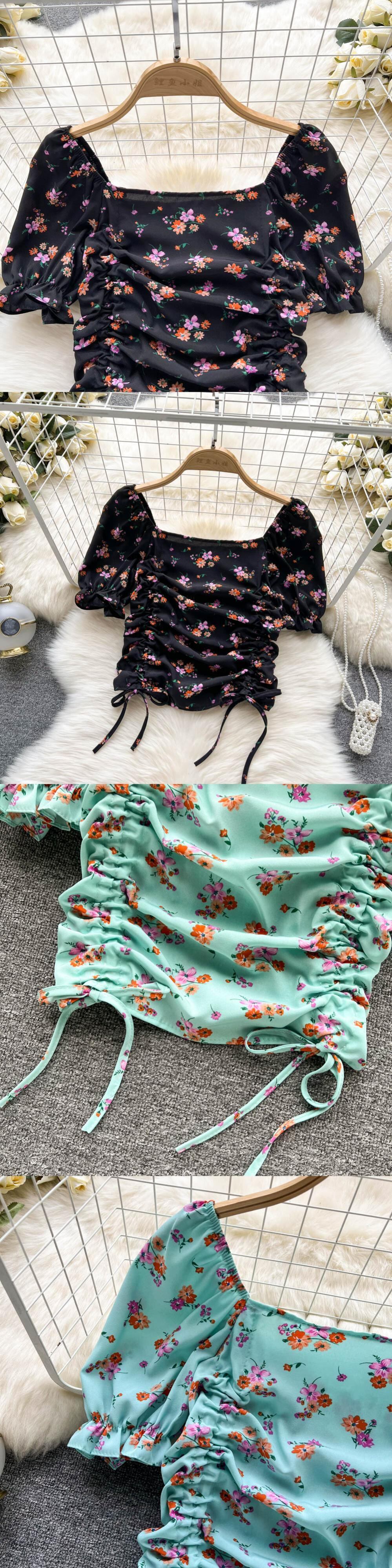 プリーツドローストリングネクタイスクエアカラープリントバブル半袖スリムフィット薄手のフローラルシャツイン韓国版トップ女性の潮 花柄 スクウェア lyxaj92512386226