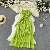 シーサイドトラベルホリデースタイルスーパーフェアリースウィート気質シフォンドレスレースウエストロータスリーフスリングロングスカート 大人ガーリー キュート カジュアル lyxaj12972659731