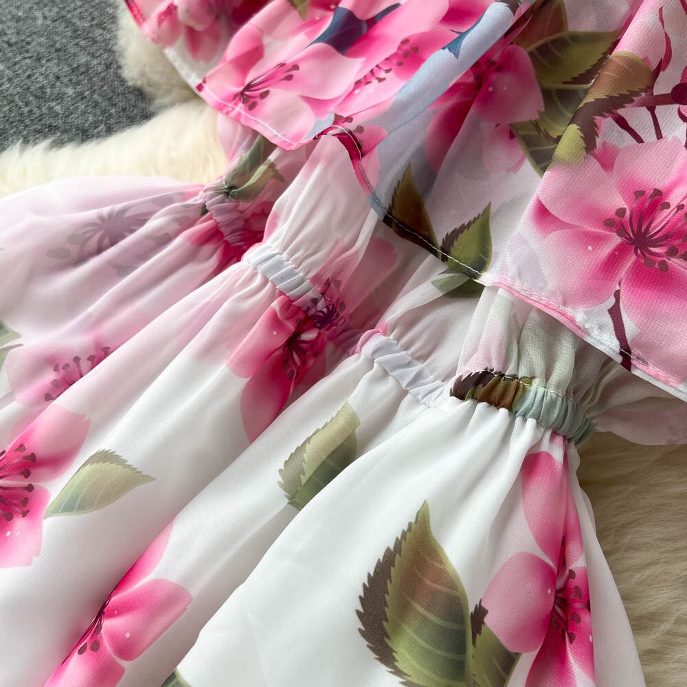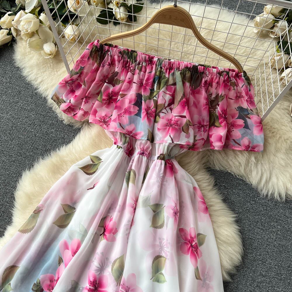 夏の新しいフリルワードネックプリントロングスカートレディースウエスト丈ビーチスカートスプリットシフォンワンピーストレンディ サマー 夏物 lyxaj7067472213