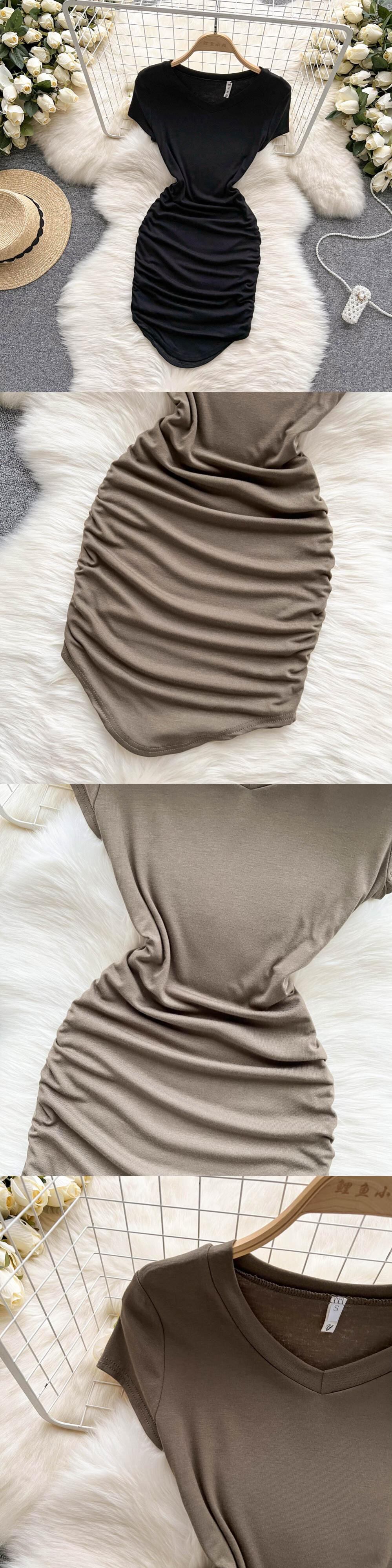 ファッショナブルなVネックドレス2022年夏新気性自家栽培スリムプリーツバッグヒップボトミングスカート女性の韓国語版 サマー 夏物 lyxaj94299349615