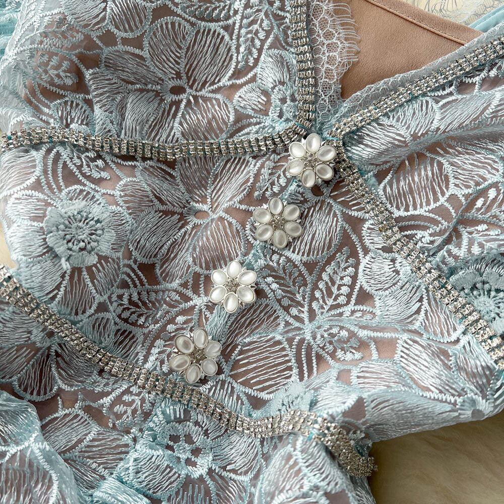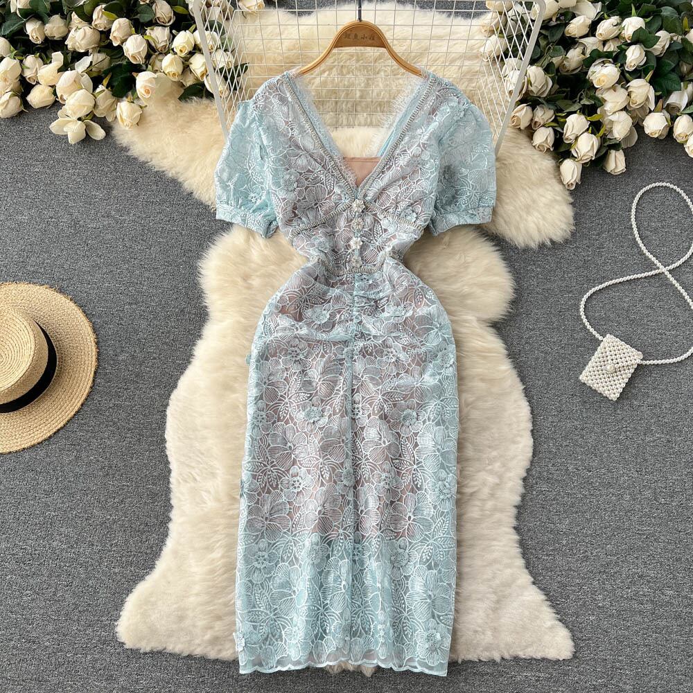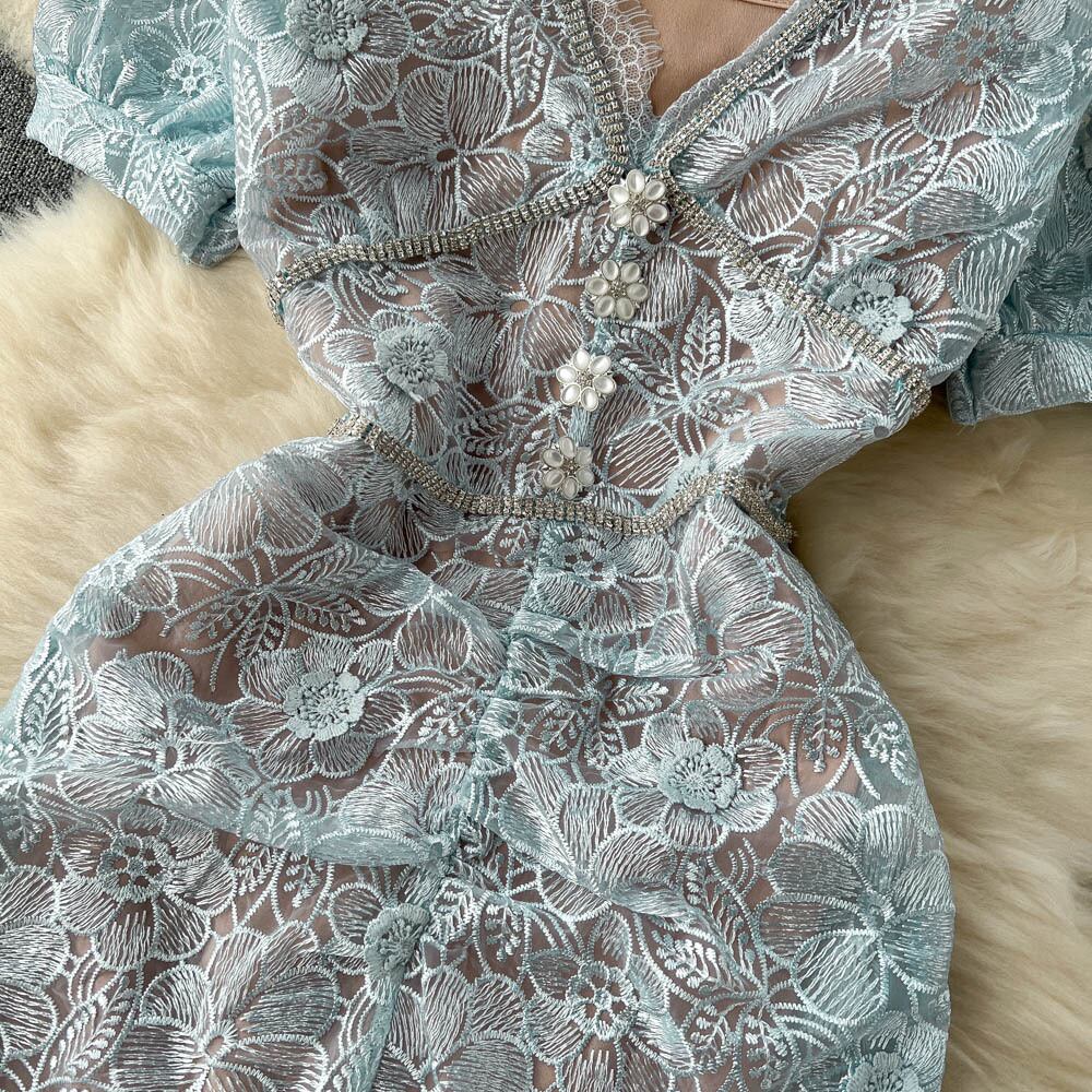 花柄ウエストと薄手のシフォンドレス気質ロングスカートパフスリーブレトロスカートの夏の新しいVネックドレス サマー 夏物 lyxaj1072216687