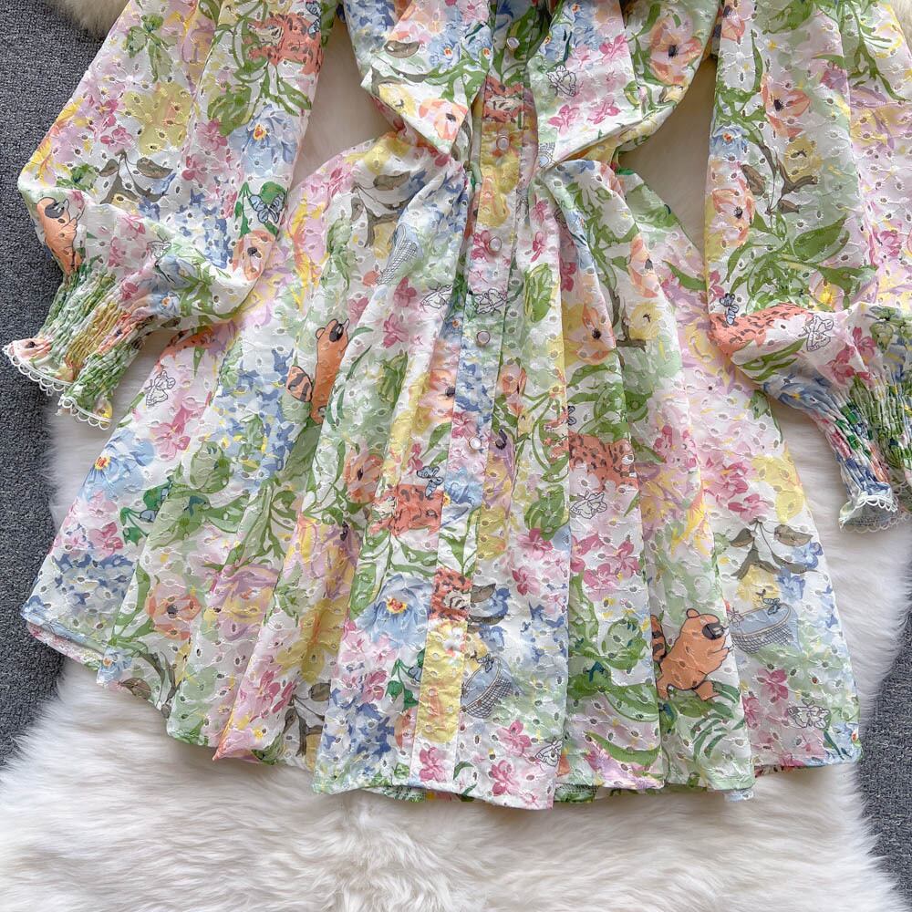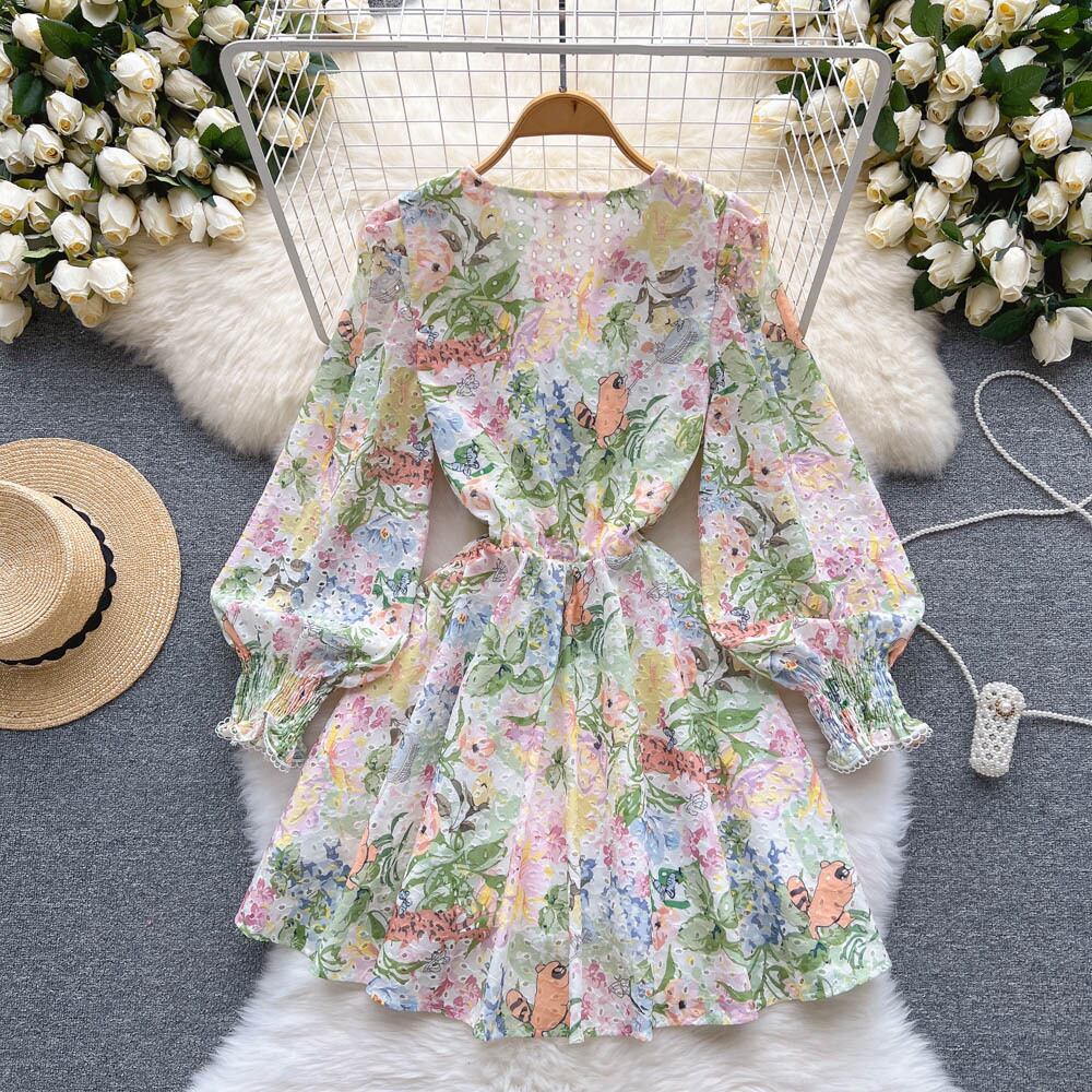 優しい風の妖精フランスの気質Vネックボウ年齢を減らすプリントランタンスリーブフローラルAワードふわふわドレス女性 リボン 花柄 lyxaj56934197863