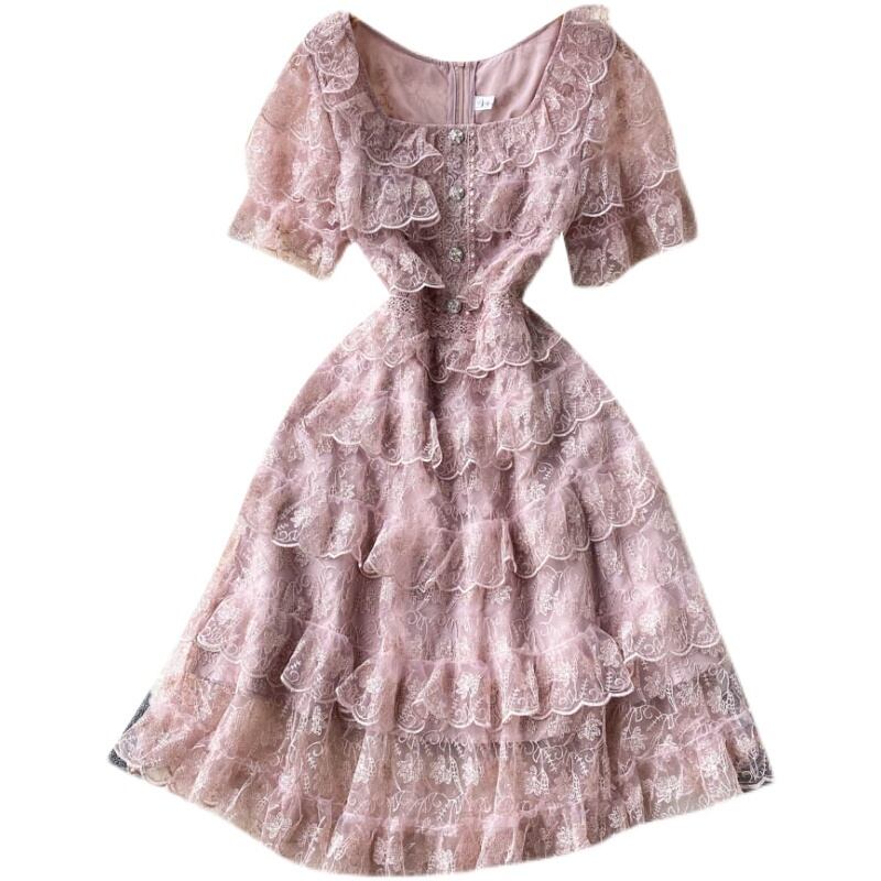 パレススタイルの小さなドレスドレス夏の女性のレトロな重工業刺繍蓮の葉トリムスリムショートメッシュドレススカート レース サマー 夏物 lyxaj71259691986