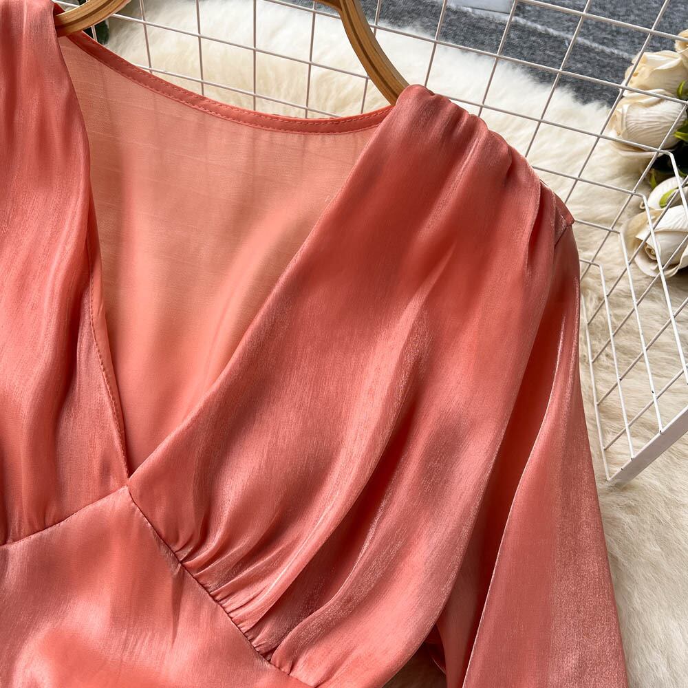 フランスの甘い初恋気質甘くてスパイシーなVネックハイエンドサテンドレス小さなスーパーフェアリーウエストAラインスカート 大人ガーリー スウィート キュート カジュアル lyxaj56543977216