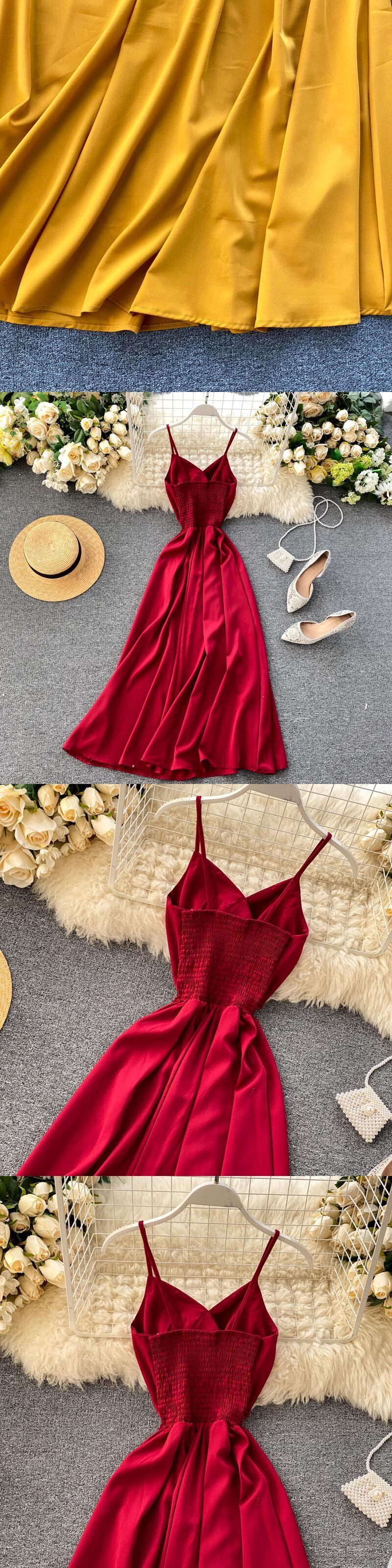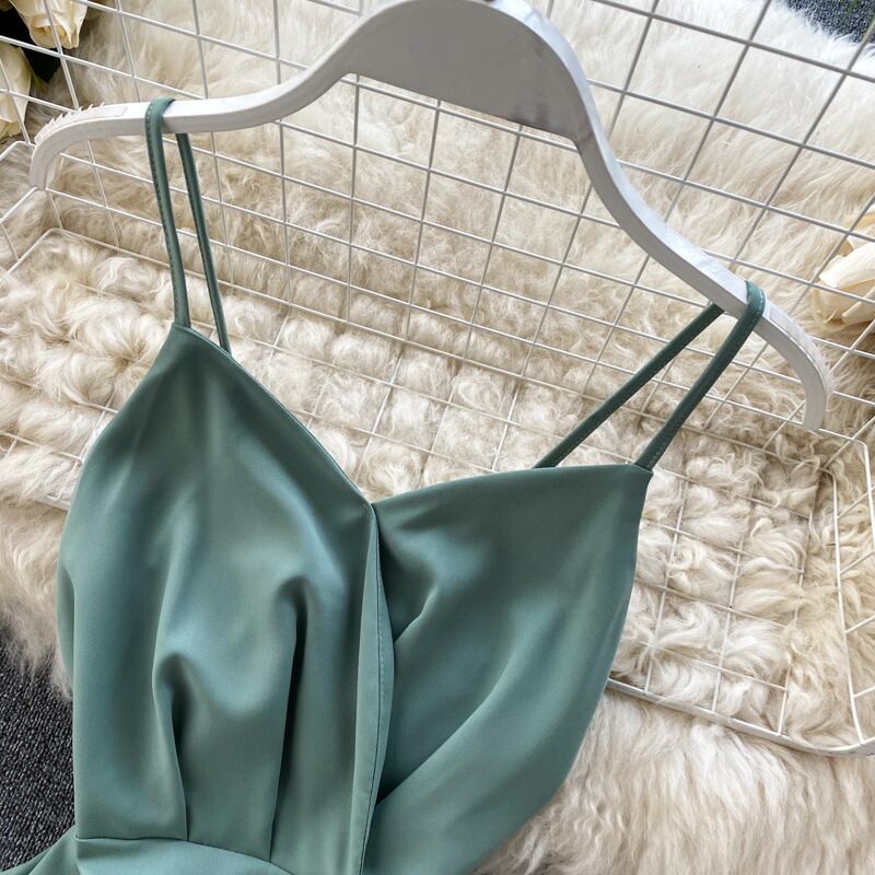 レトロ無地気質ドレススカートVネックバックレスノースリーブウエストスリムフェアリードレスホリデーサスペンダードレス ソリッドカラー lyxaj74323555561