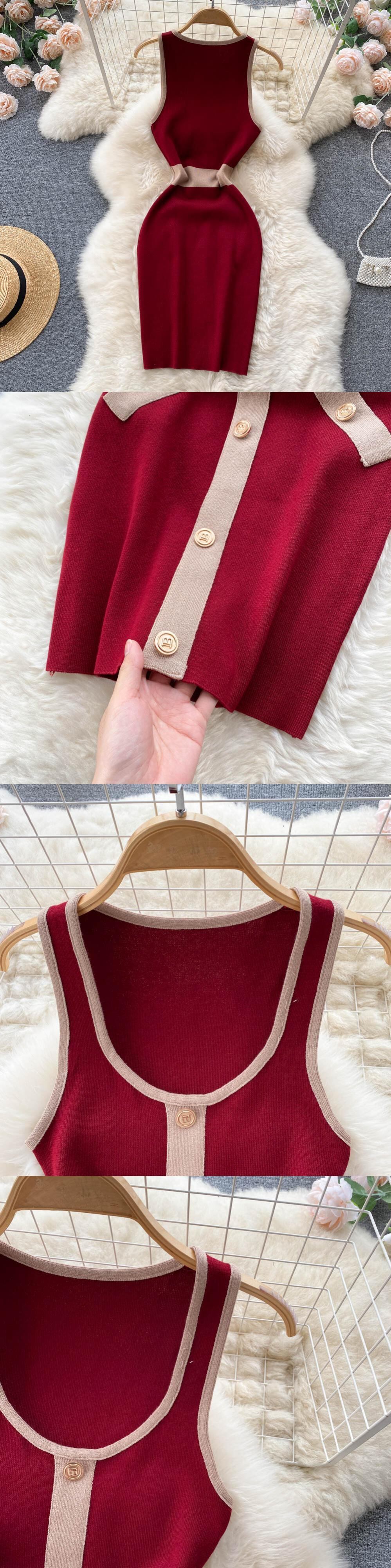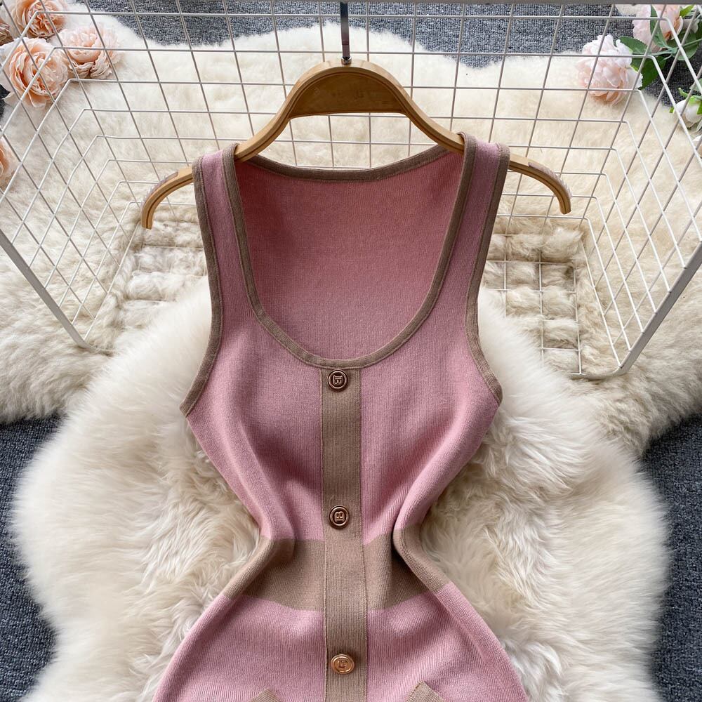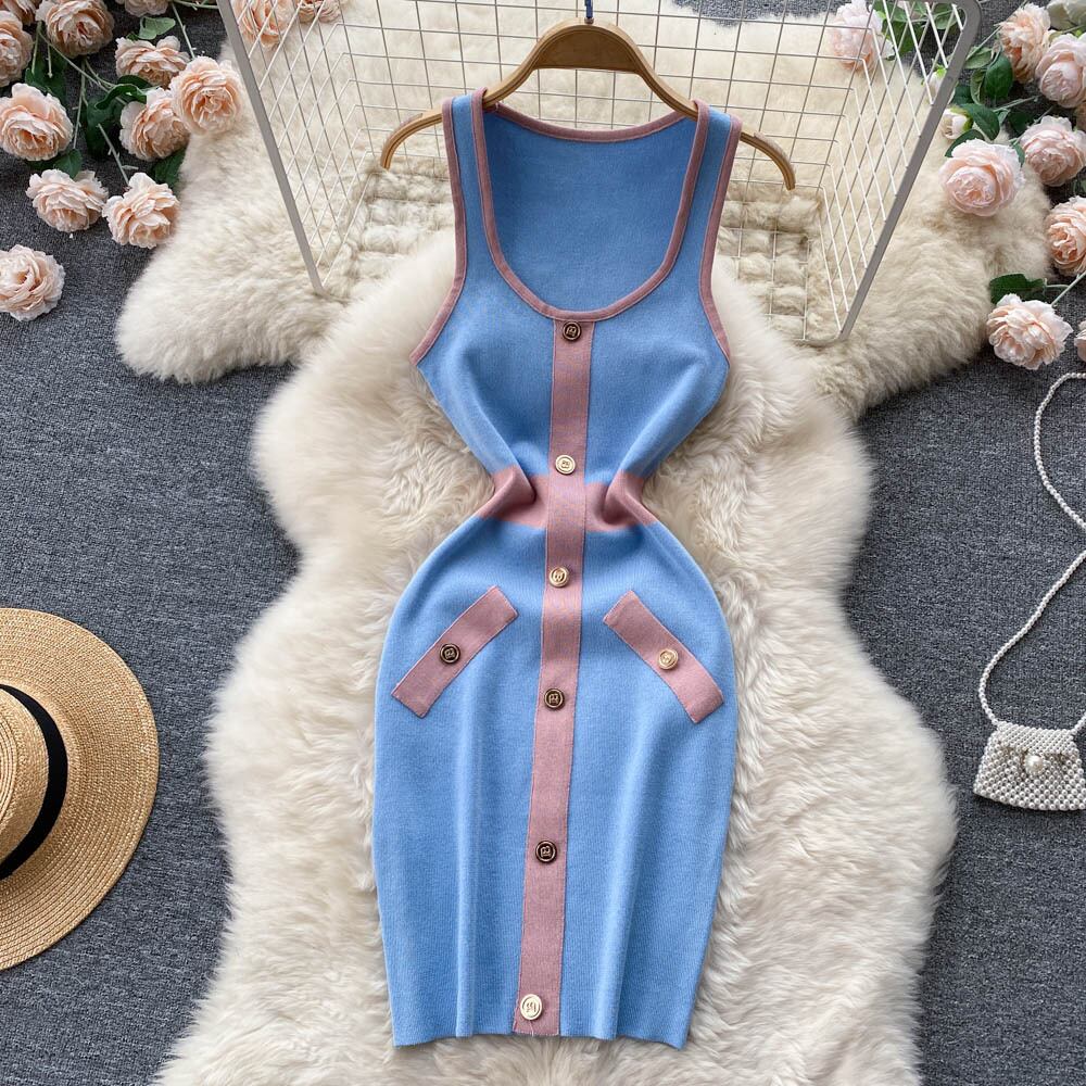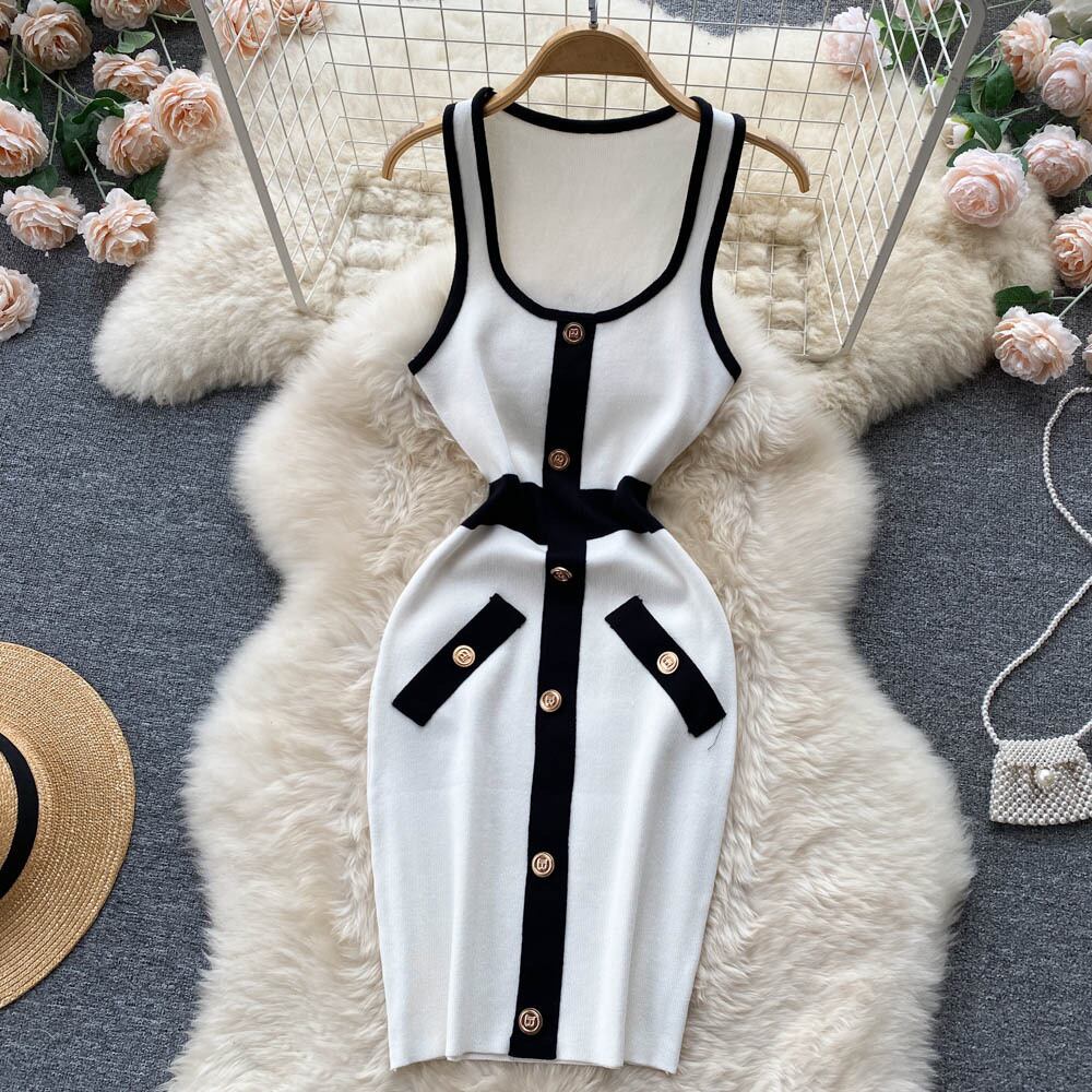 レトロでセクシーなレディースドレス女性の黒と白のコントラストカラーストライプタイトなシングルブレストニットノースリーブシックなスカートトレンディ ホワイト ブラック lyxaj92253866619