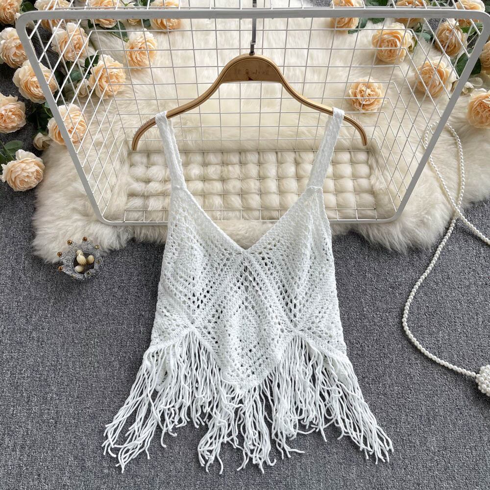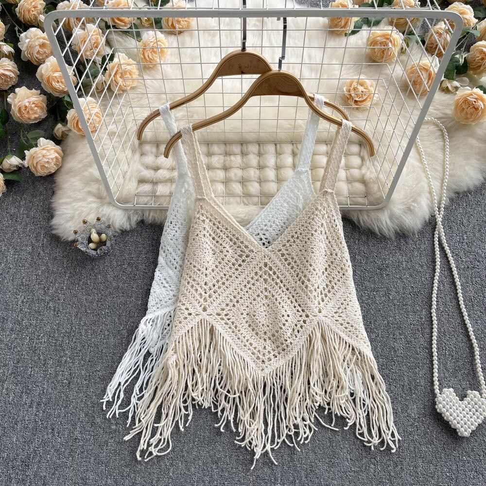 ボヘミアンホローニットブラウスショートフリンジキャミソールエスニックスタイルトップサマーデザインアウターウェア 夏物 lyxaj73020130790