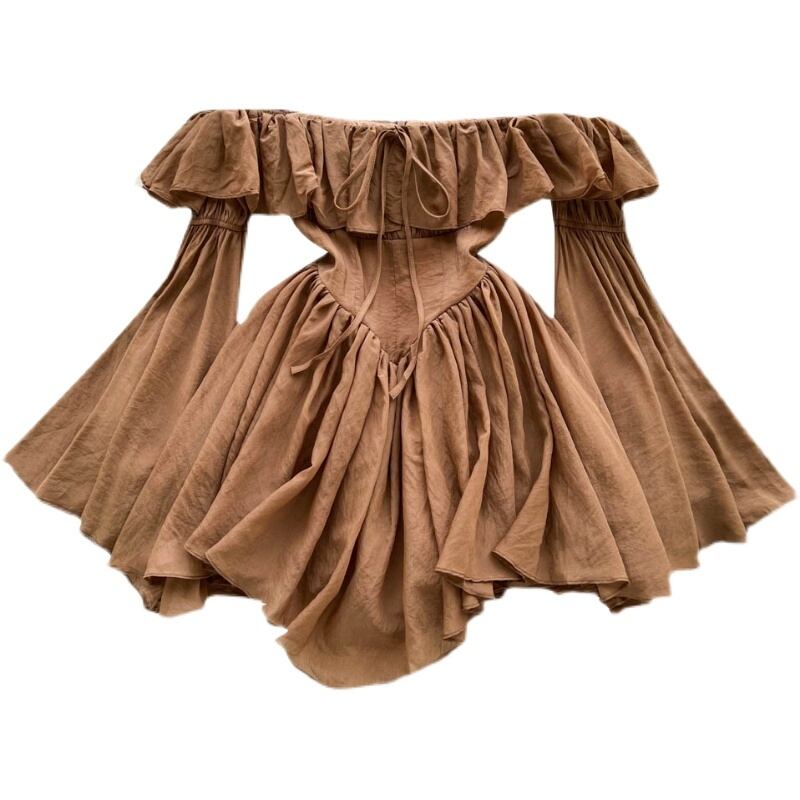 ホットガールスタイルセクシーなオフショルダーワンワードカラードレス女性の夏の新しい小さなオールマッチショート気質ウエストスカート サマー 夏物 lyxaj66197541691
