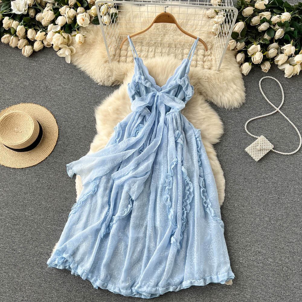 スカートは優しくて小さい、Vネックのオフショルダーのフェアリーサスペンダー、大スイングのロングスカート、ベルフラワーフレンチティーブレイク、初恋のドレス フラワーデザイン lyxaj7393940478