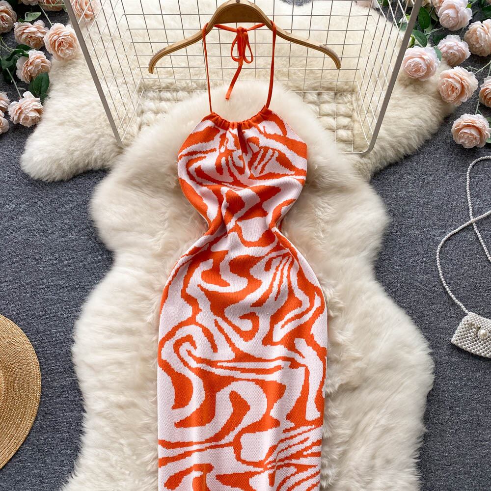 セクシーな背中の開いた海辺のホリデードレス、有名人の気質、ホルターネック、スリムなフィット感と痩身、お尻、ノースリーブの気質、ニットドレス lyxaj95135413587