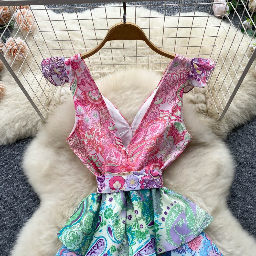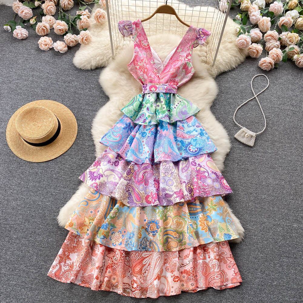 ヨーロッパとアメリカのキャットウォークスタイルのプリントドレス見事なスカートハイエンドフランスのセクシーなローカットVネックレイヤードケーキスカート レッド ヨーロピアン lyxaj23099639288