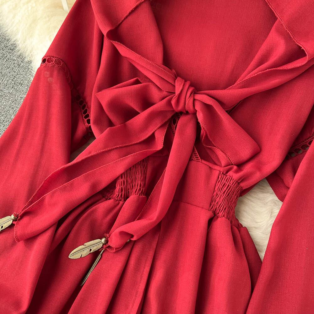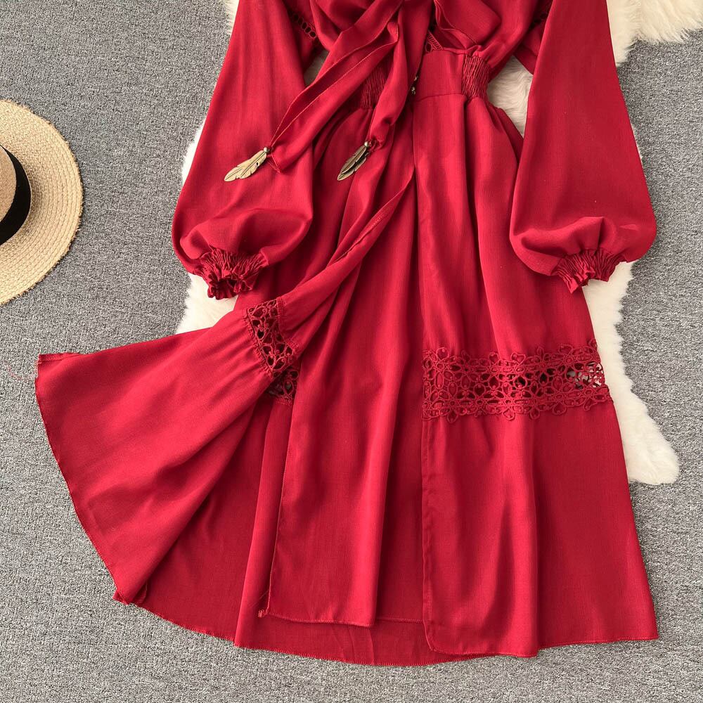 雲南エスニックスタイルトラベルホリデースカートレトロレッドフード付きウエストラージスイングスカートスーパーフェアリースウィート気質ドレス 大人ガーリー キュート カジュアル lyxaj5428910651