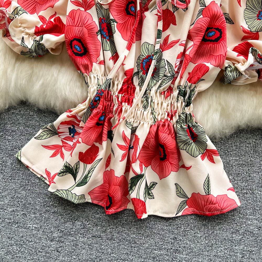 夏の新しいスウィートオールマッチフローラルプリントウエストスリムフリル裾半袖トップレディースウエスタンスタイルシャツ 大人ガーリー キュート カジュアル サマー 夏物 花柄 lyxaj22408782444