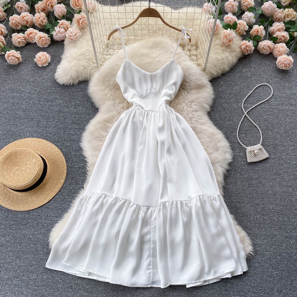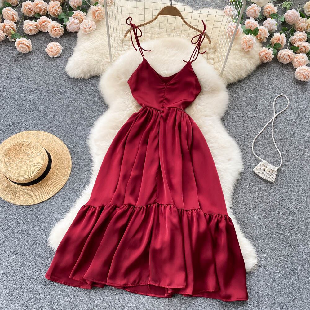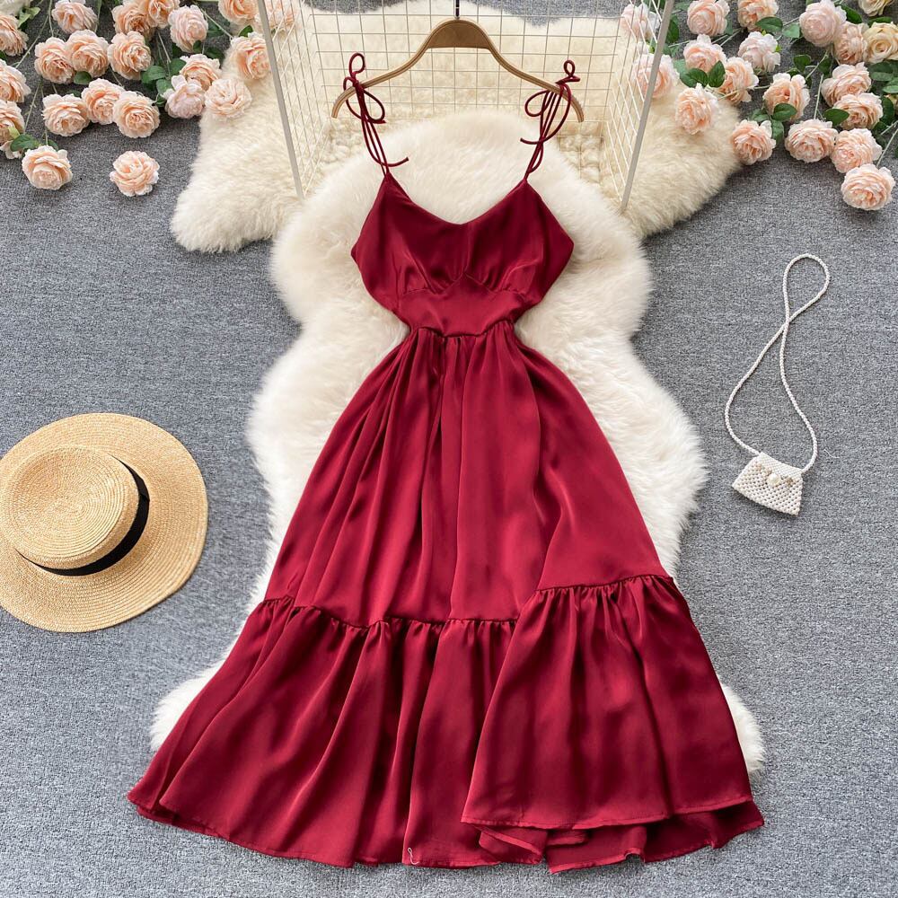 ニッチなバックレスフリルスカートサスペンシーサイドサスペンダードレスの夏の新デザインセンスプリーツロングスカートトレンディ サマー 夏物 サテン lyxaj84862625598