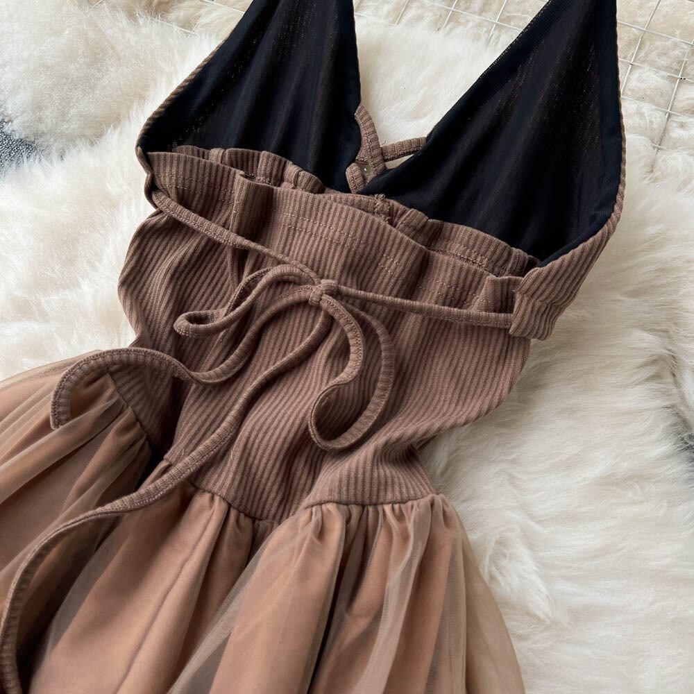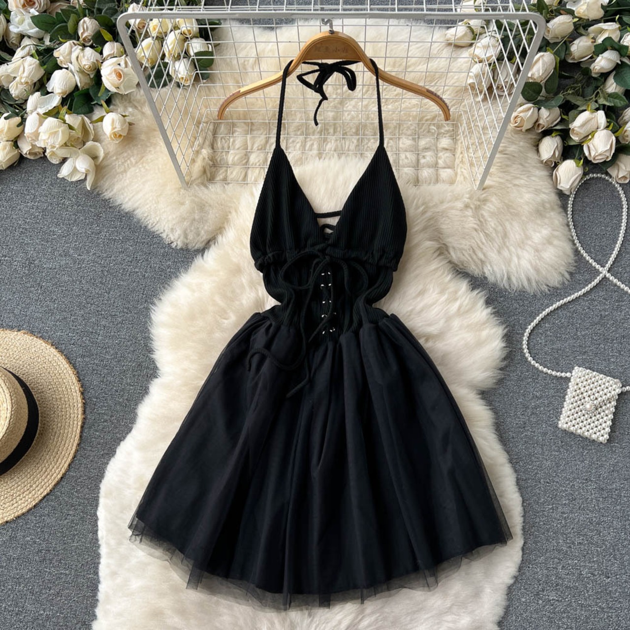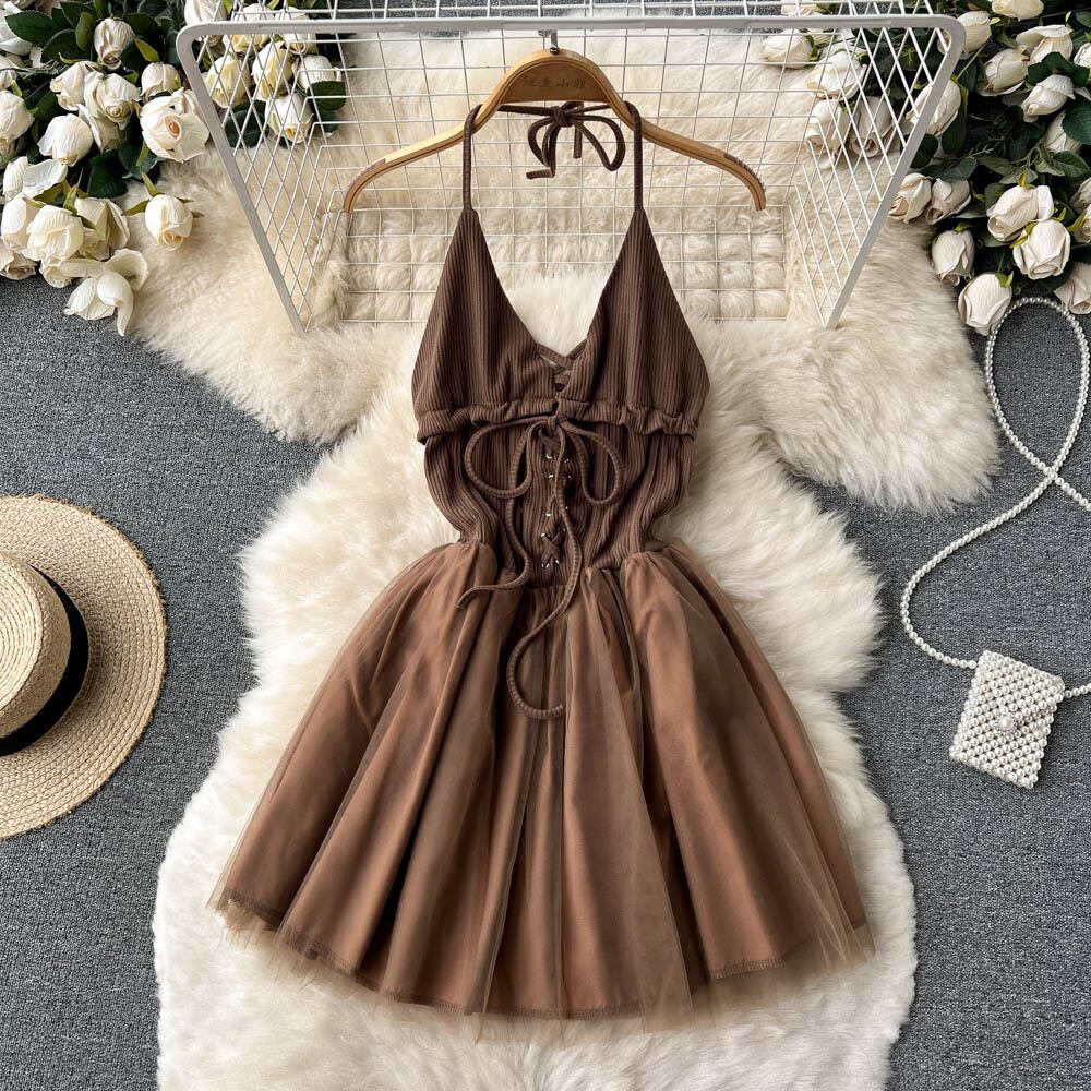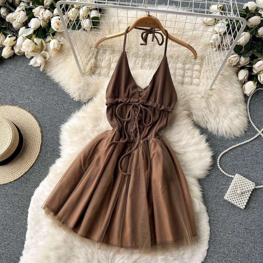 フランスのニッチな純粋な欲望風ホルターネックVネックドレス小さな女の子夏セクシーな背中の開いたウエストふくらんでいるスカート サマー 夏物 ピュア lyxaj62552228179