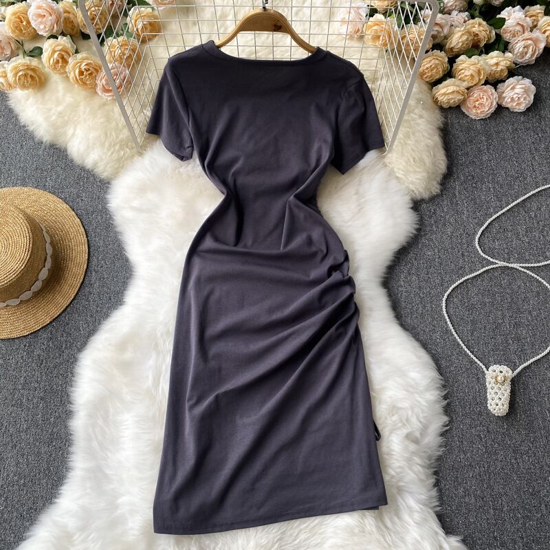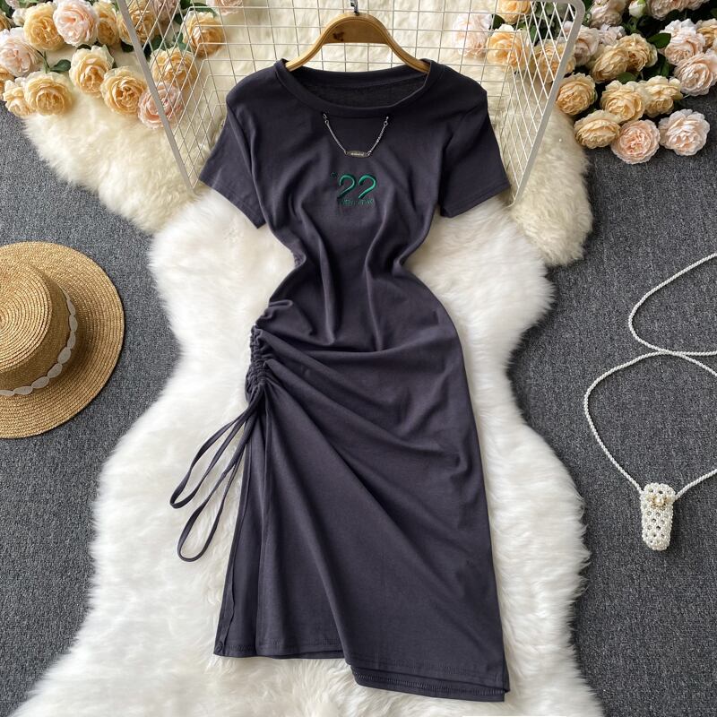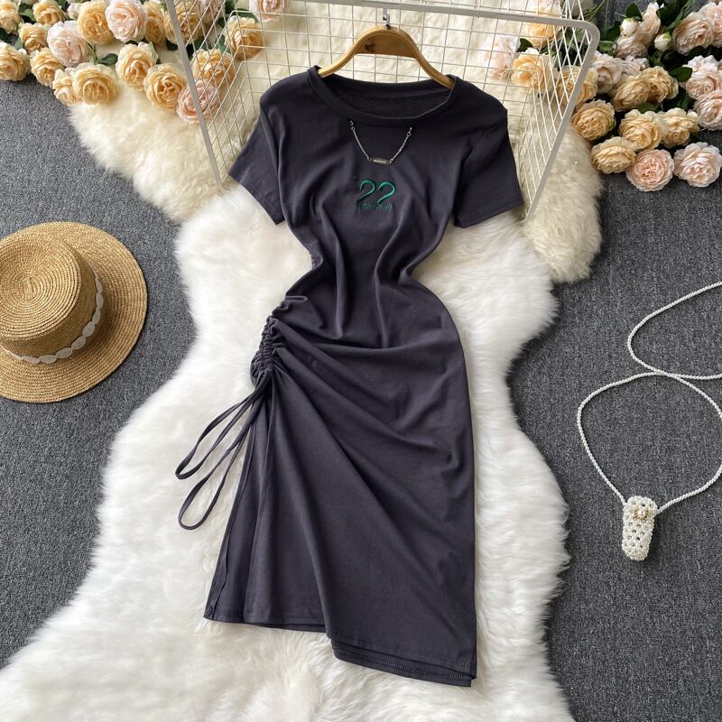 韓国版ファッションガーリーレター刺繍半袖Tシャツワンピースレディース巾着レーススリムスリットバッグヒップスカート lyxaj62063016963