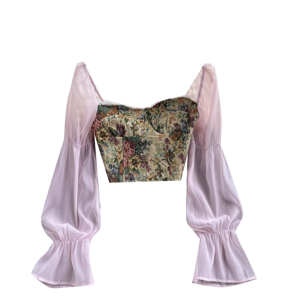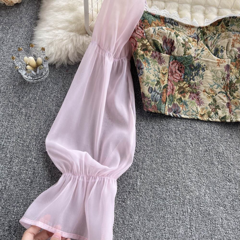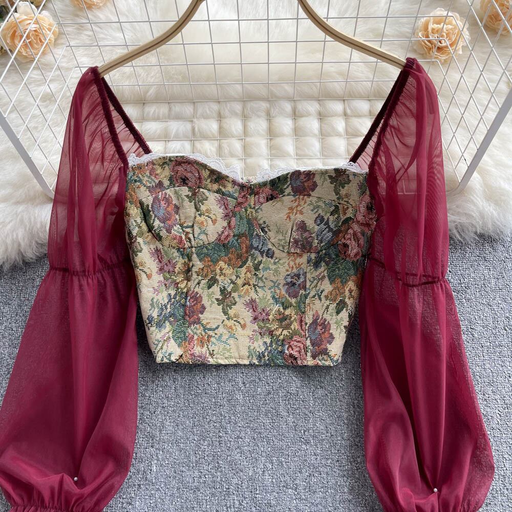 ショートトップレディースデザインセンスニッチレトロジャカードハイエンド気質露出鎖骨スリムシフォン長袖シャツ ロング lyxaj20151382679