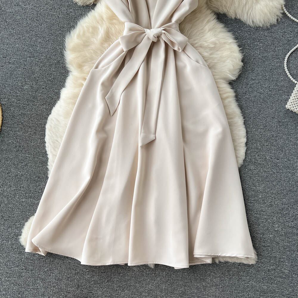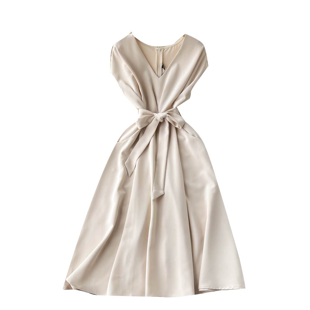 優しい、おしとやかな気質、Vネックのネクタイ、シンプルな無地、ロイヤルシスターの気質、ロングスカート、ウエスト、薄手の膝上ドレス ソリッドカラー lyxaj72418504600