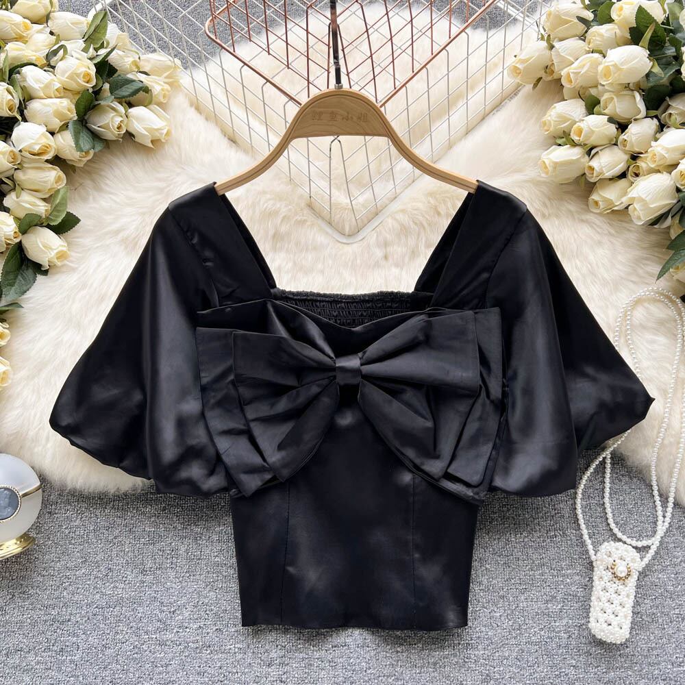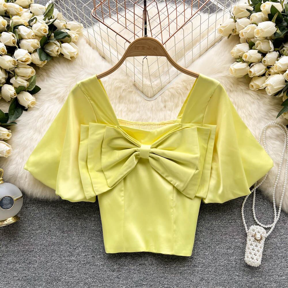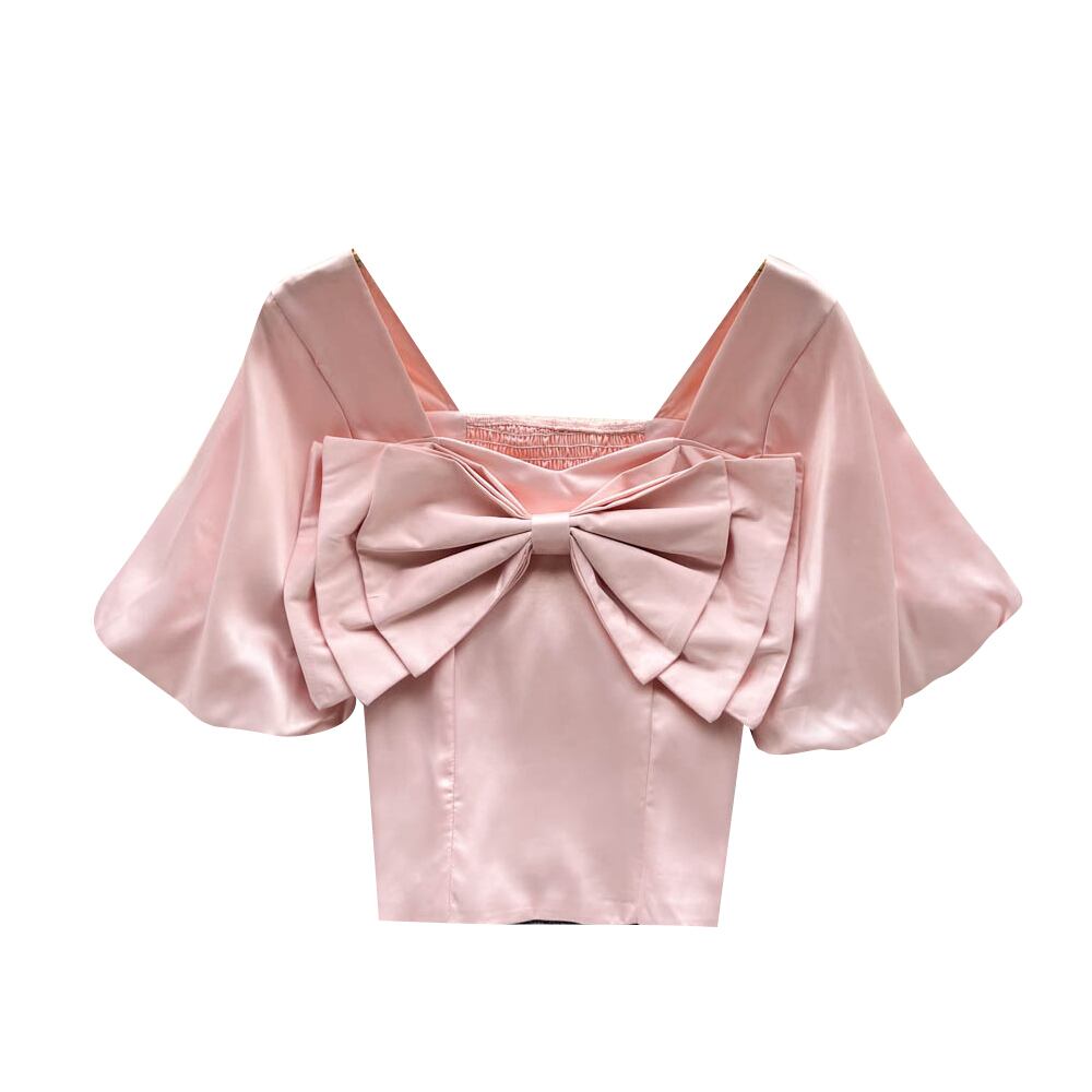 2022年夏の新気性レトロスクエアネックボウシャツパフスリーブスリム半袖トップ女性の潮 リボン サマー 夏物 スクウェア lyxaj11776574958