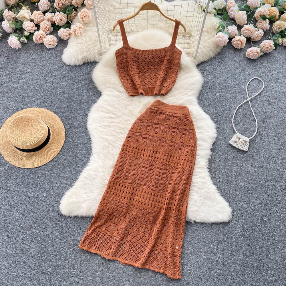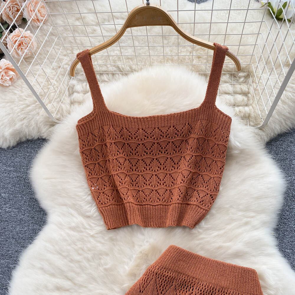 甘くてスパイシーなファッション中空キャミソールレディースショートアウターニットツーピーススーツハイウエストスリットスカート夏 ハイウェスト 大人ガーリー スウィート キュート カジュアル サマー 夏物 lyxaj48596843749