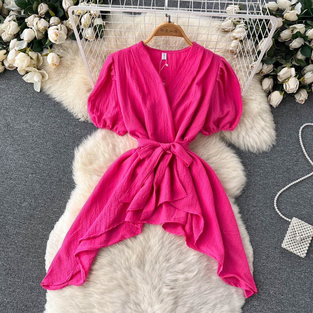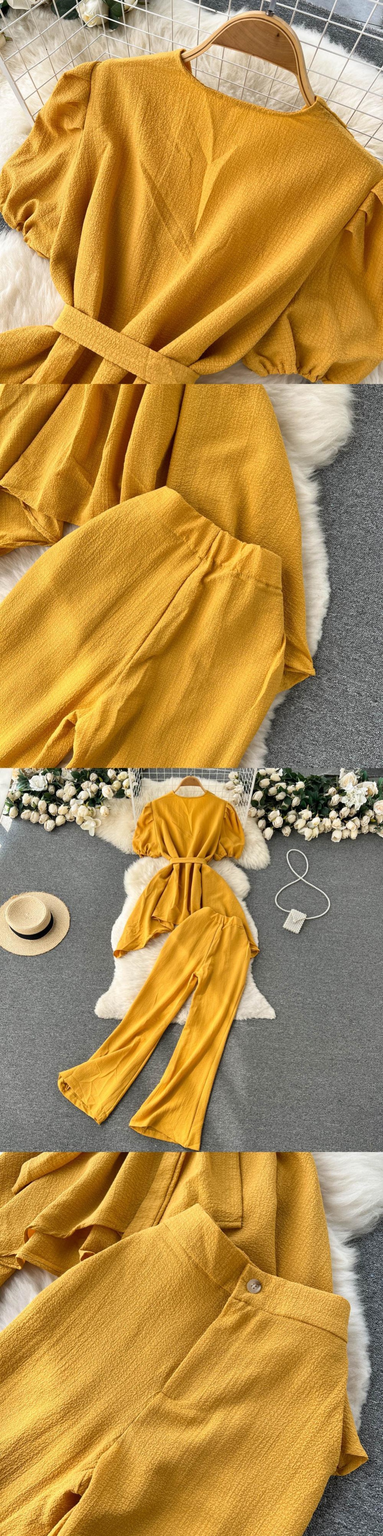 テンペラメントセレブシフォンスーツレディースサマーイレギュラーバンデージパフスリーブトップハイウエストフレアパンツツーピースセット ハイウェスト レッド 夏物 lyxaj34872849235