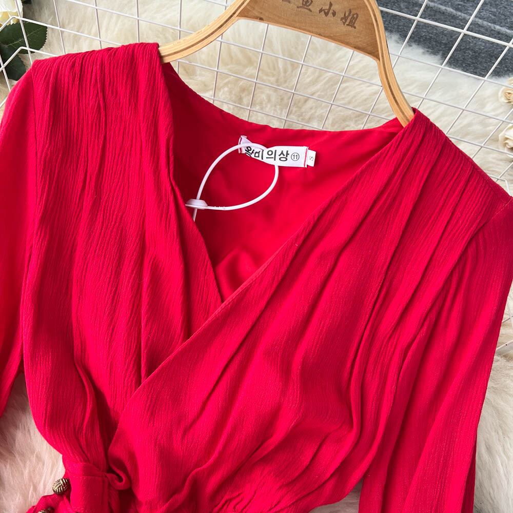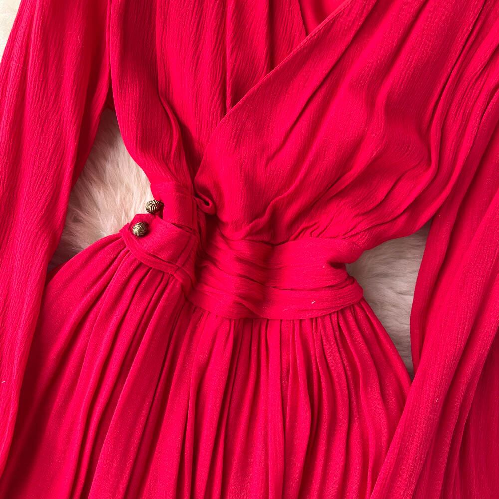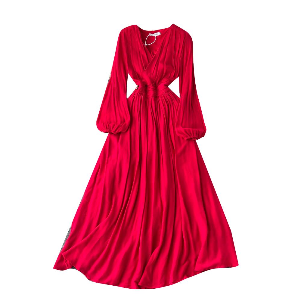エスニックスタイルのVネックパフスリーブレトロドレス2022新しい早春ボヘミアン気質プリーツロングスカート スプリング 春物 lyxaj99065031472