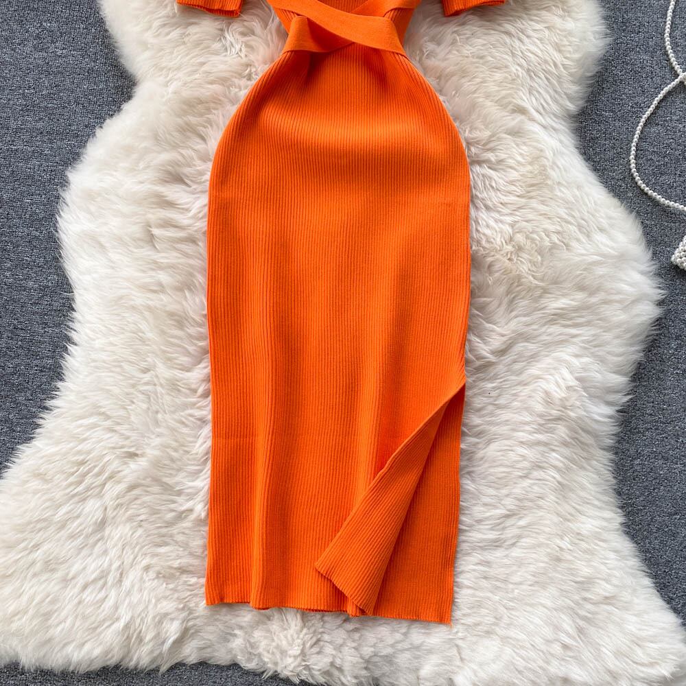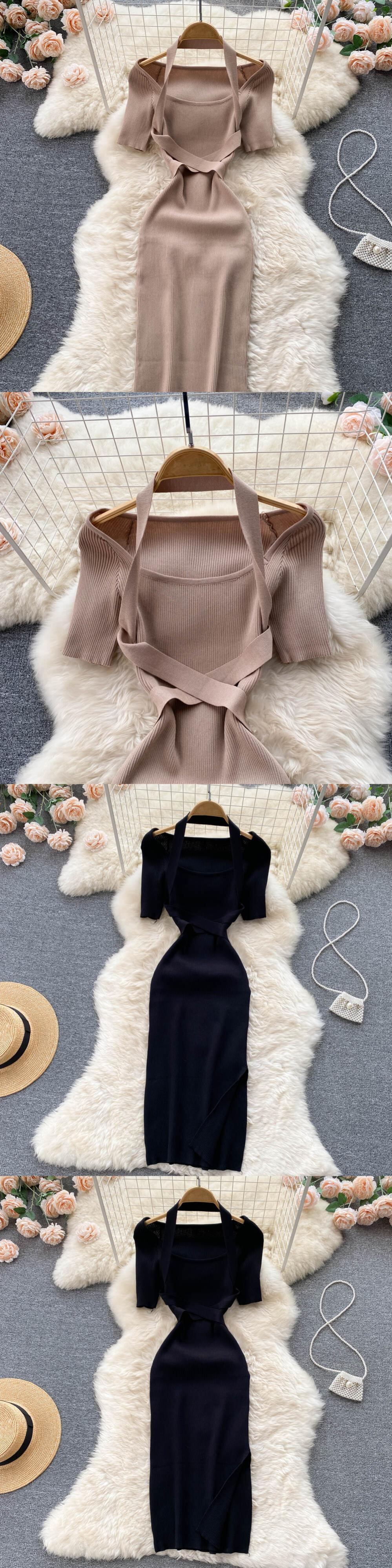 セクシーなオフショルダーホルターネックドレスミッドレングス2022夏の新しい不規則なハイウエストボトミングニットスカートトレンド サマー 夏物 lyxaj39469534142