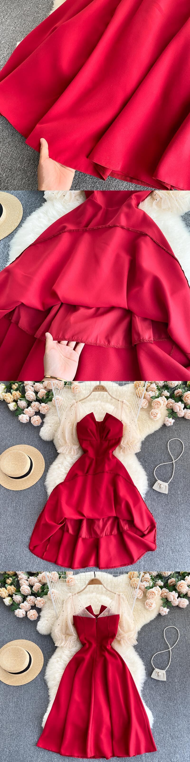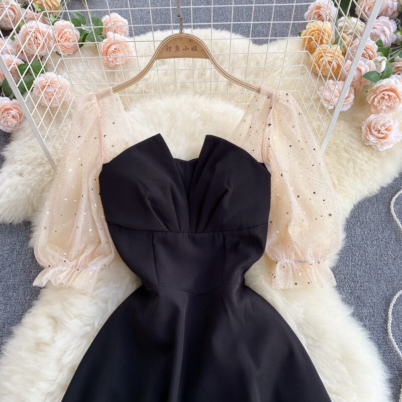 ドレス2022新しいサマードレスの女神ファン気質Vネックデザインセンスメッシュパフスリーブステッチスリムドレス 夏物 lyxaj35795979777